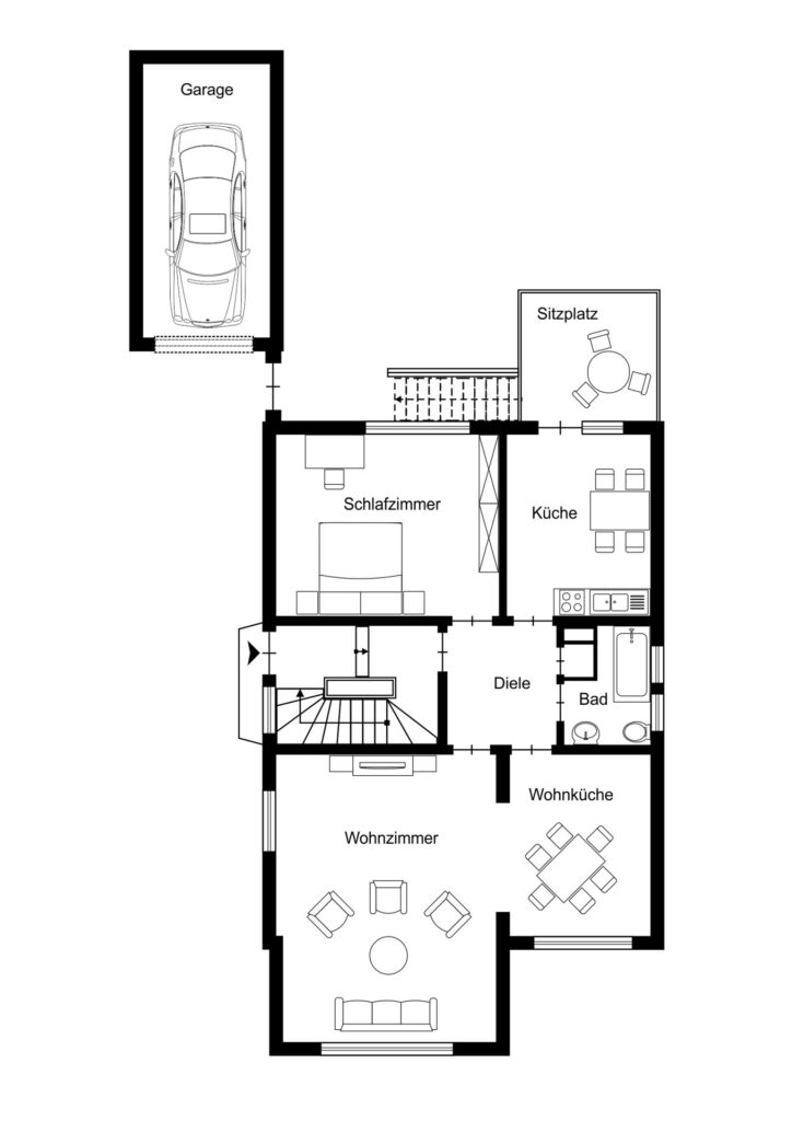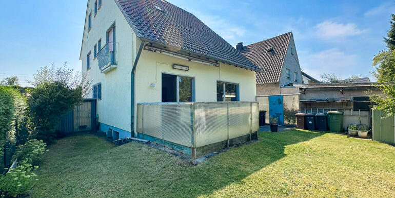 Das 407 m² große Grundstück ist vollständig eingefriedet und eröffnet verschiedene Nutzungsmöglichkeiten. Zwei Garagen sowie zusätzliche Stellplätze vor dem Haus stehen zur Verfügung. Der Gartenbereich ist über die Terrasse der Erdgeschosswohnung, eine Seitentüre oder direkt über eine der Garagen zugänglich.