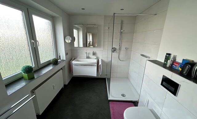 Ein besonderes Highlight ist das neu gestaltete Badezimmer, das modernen Wohnkomfort bietet. Zusätzlich steht ein separates Gäste-WC zur Verfügung. Teilweise elektrische Rollläden sorgen für zusätzlichen Komfort und eine erhöhte Wohnqualität.