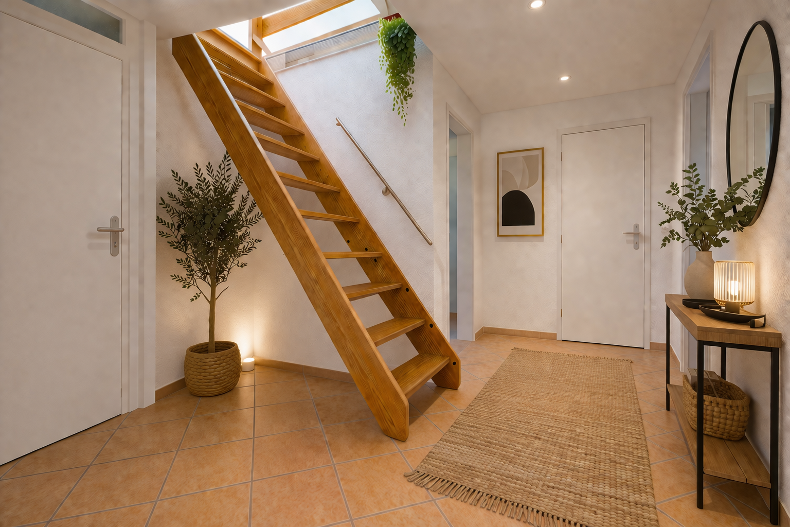 Über das Treppenhaus erreichen Sie die Wohnung im Dachgeschoss und gelangen in die zentrale Diele, von der aus sämtliche Räume erschlossen werden.