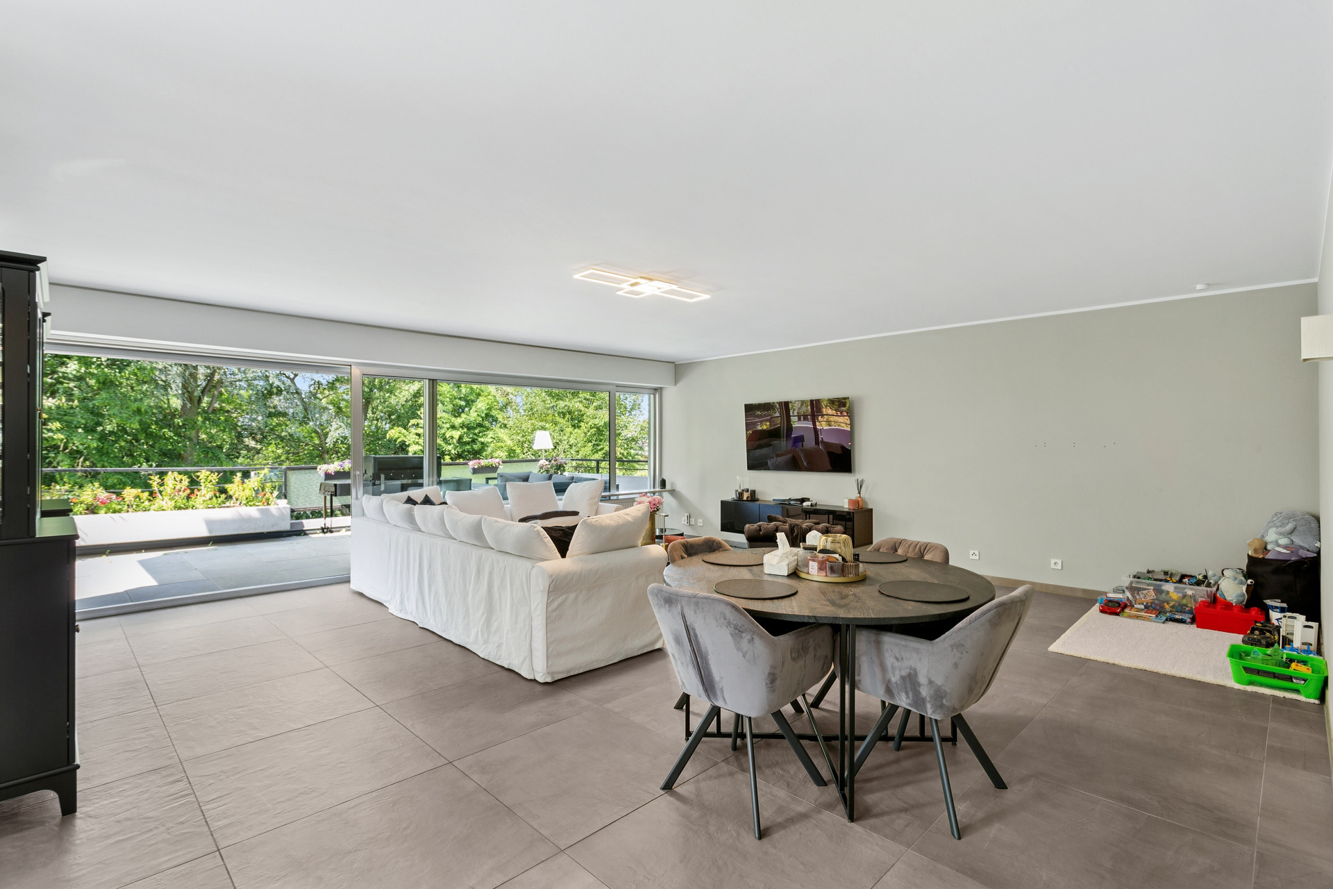 Die gesamte Wohnung ist mit hochwertigen, großformatigen Fliesenböden in moderner Betonoptik ausgestattet und vermittelt ein stilvolles, zeitgemäßes Wohngefühl.