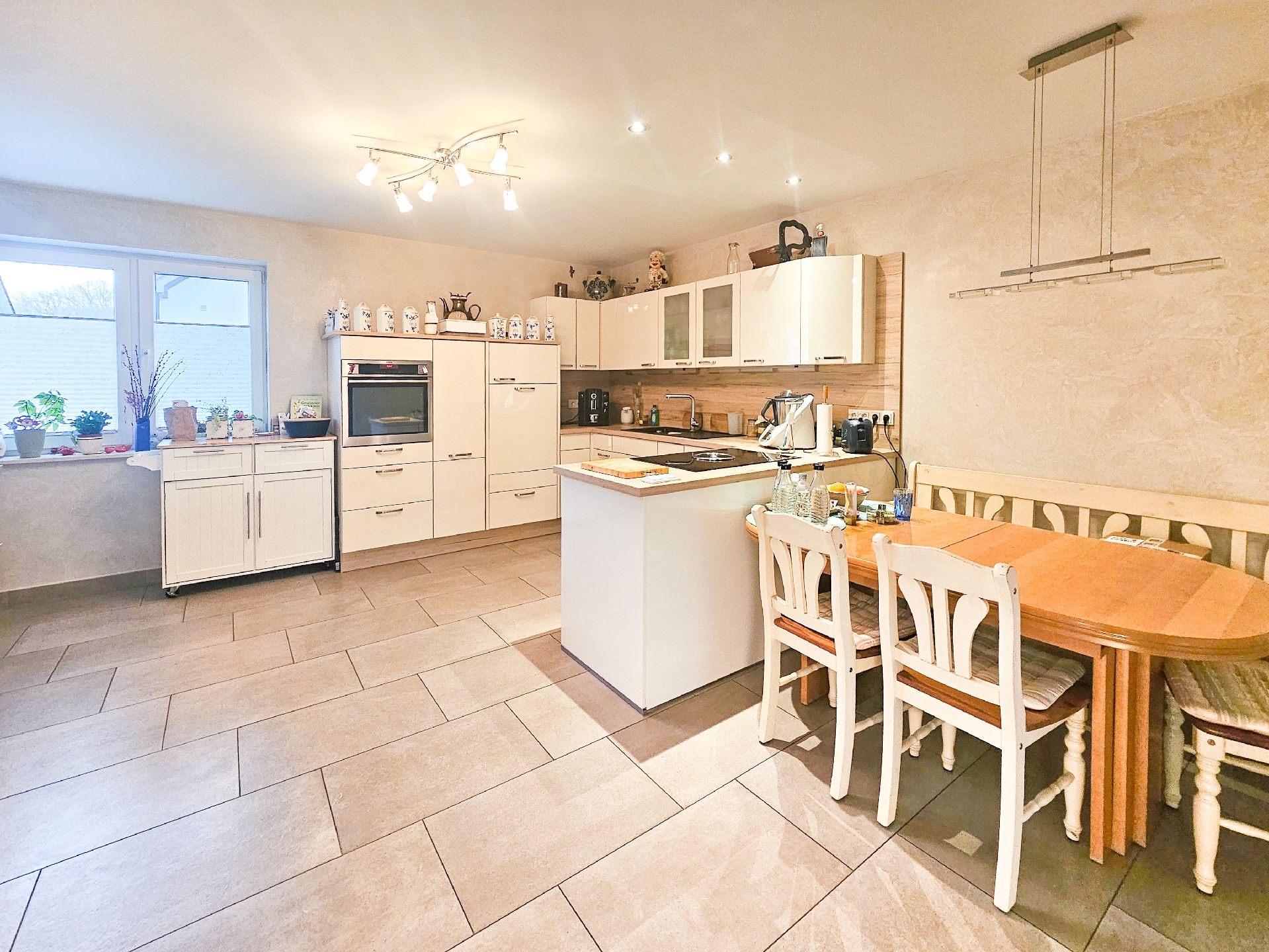 eignet. Die über 20 m² große Wohnküche bietet nicht nur ausreichend Platz, sondern ist mit hochwertigen Elektrogeräten und stilvollen Einbauten ausgestattet, sodass sie sowohl funktional als auch optisch überzeugt.