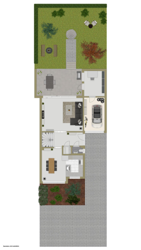 Das Erdgeschoss überzeugt mit einem hellen Wohnbereich, separiertem Wohnzimmer mit Zugang zur überdachten Terrasse und einem praktisch geschnittenen Koch- und Essbereich. Eine Fußbodenheizung sorgt hier für zusätzlichen Wohnkomfort. Ergänzt wird das Erdgeschoss durch ein Gäste-WC sowie den direkten Zugang von der langen Garage auf die Terrasse.