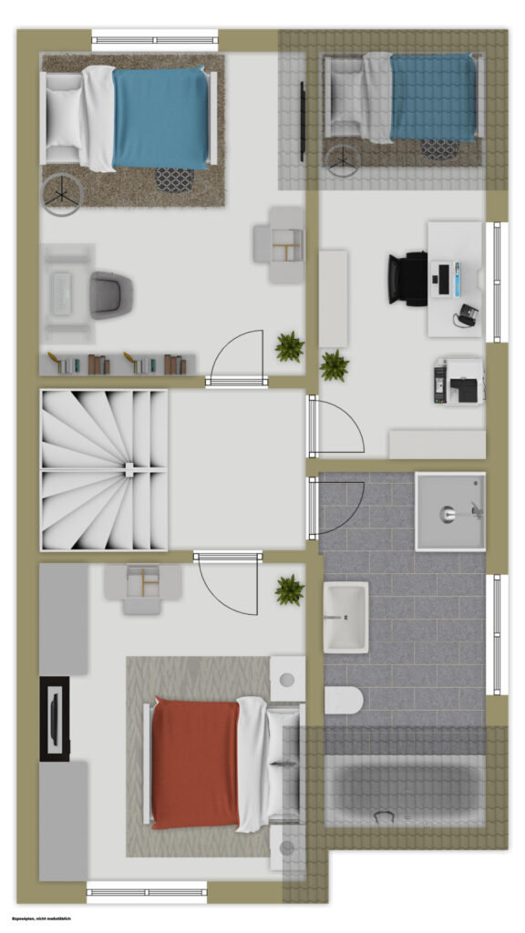 Im Obergeschoss stehen drei flexibel nutzbare Zimmer sowie ein vor wenigen Jahren modernisiertes Tageslichtbad mit Badewanne und Dusche zur Verfügung. Das Dachgeschoss bietet zusätzliche Fläche, ideal für Homeoffice oder Hobby, und ist dank Glasfaseranschluss bestens ausgestattet.