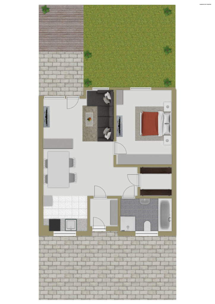 Auf ca. 71 m² entfalten sich zwei großzügige, lichtdurchflutete Räume. Der offene Wohn-, Ess- und Kochbereich lädt zum Kochen, Entspannen oder zu geselligen Abenden ein und öffnet sich nahtlos zur überdachten Terrasse. Ergänzt wird der Wohnraum durch den angrenzenden, eingezäunten Gartenanteil, ideal für einen ruhigen Kaffee am Morgen, einen sonnigen Nachmittag oder ein gemütliches Beisammensein im Freien.