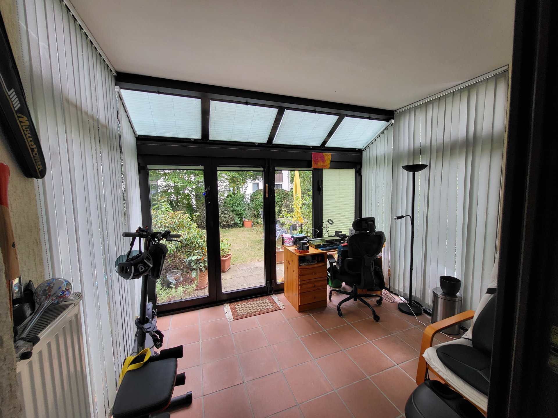 Besonders charmant ist die überdachte Terrasse, die an den Seiten und nach vorne offen ist und direkt vom Wohnzimmer über eine Glastür zugänglich ist. Hier lässt sich der Garten an sonnigen Tagen genießen – sei es zum Frühstück, zum Lesen oder für gesellige Stunden im Freien.
