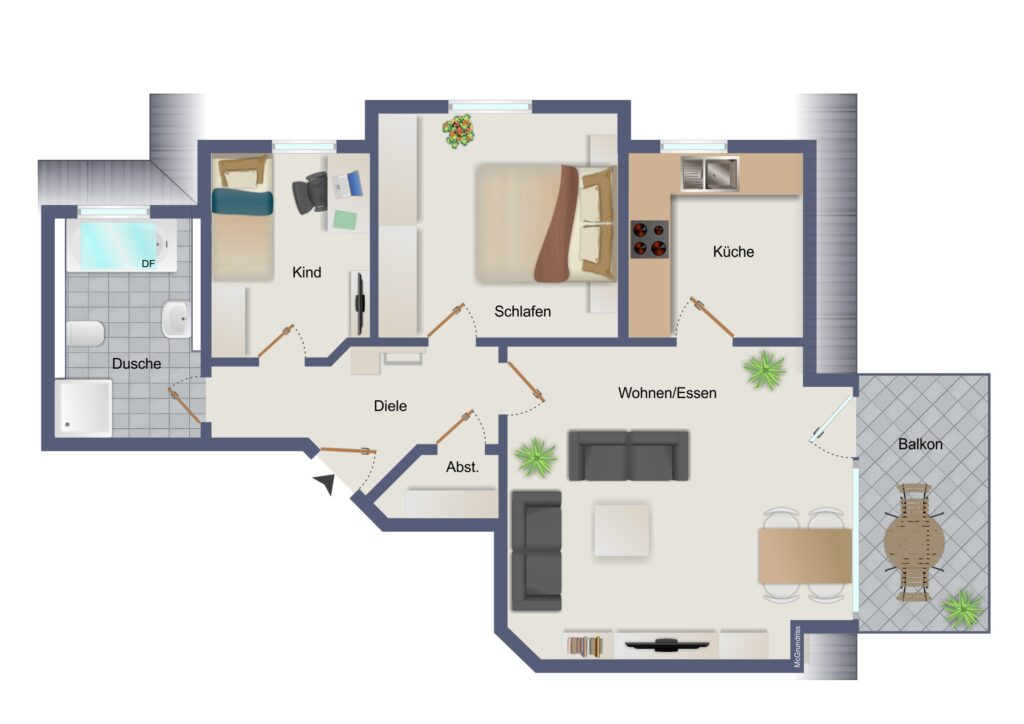 3 Zimmer, Küche, Diele, Bad/WC, Abstellraum, Balkon sowie Kellerraum und Carport.