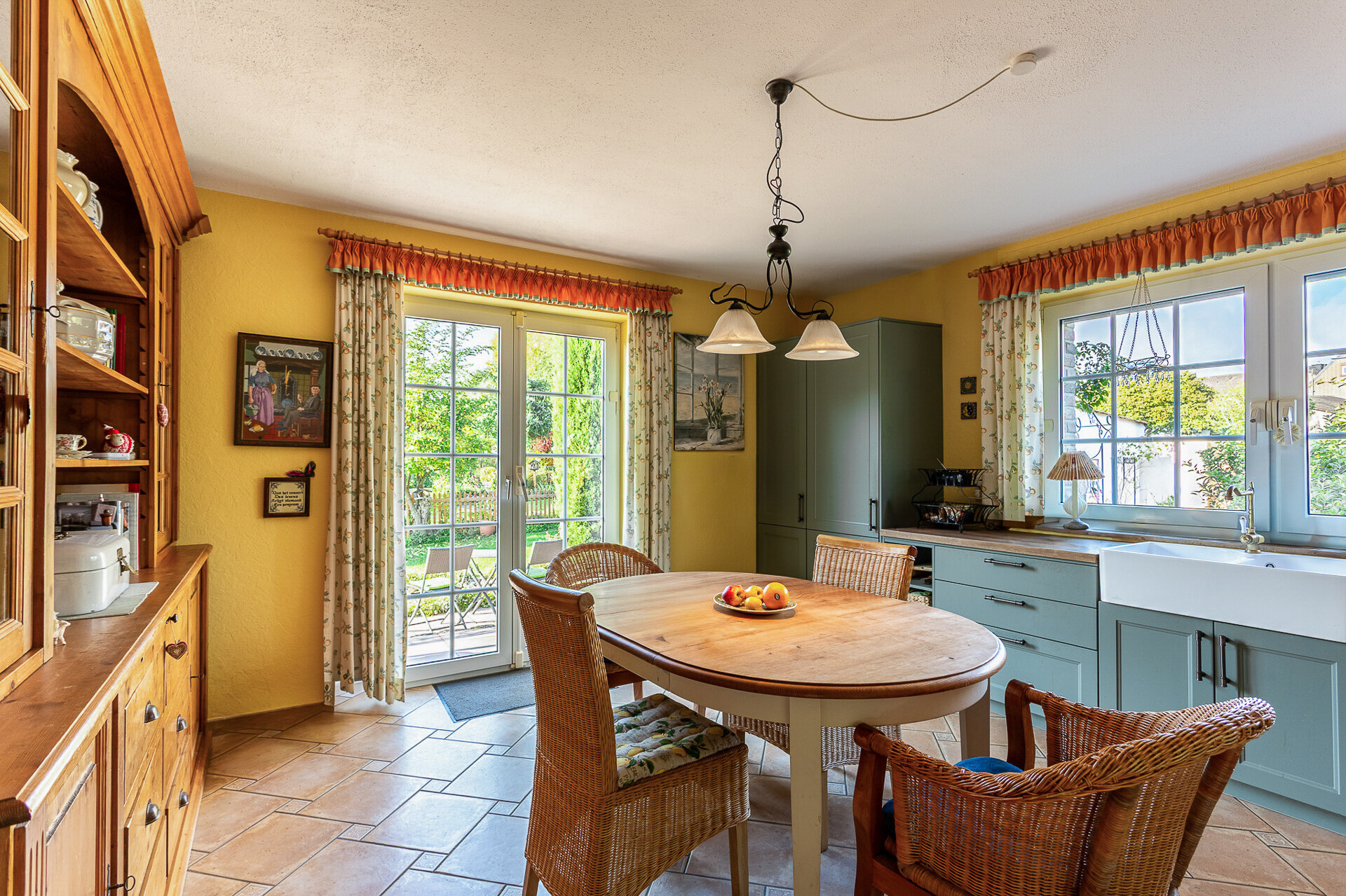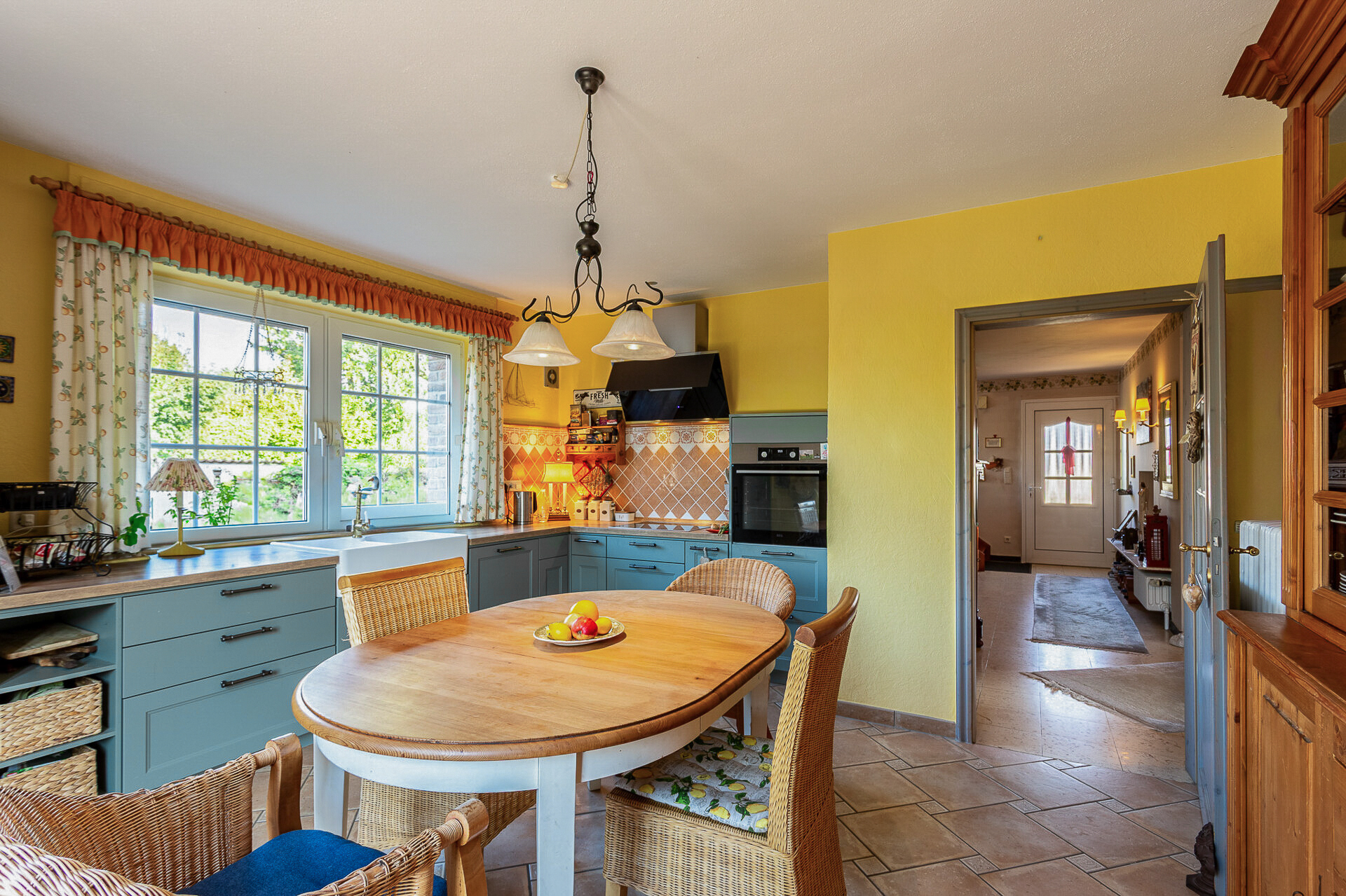 Beim Betreten des Erdgeschosses öffnet sich ein großzügig geschnittener Flur, von dem alle Räume erreichbar sind. Das Erdgeschoss umfasst ein Badezimmer mit Tageslichtfenster und Badewanne, eine traumhafte Wohnküche mit direktem Zugang zur Terrasse/Garten mit schönem Blick ins Grüne, ein gemütliches Wohnzimmer mit Kaminofen und großen Fensterfronten sowie ein Schlafzimmer. Die hochwertige Einbauküche stammt aus dem Jahr 2023. Während Flur, Küche und Badezimmer gefliest sind, verfügt das Schlafzimmer über einen Holzboden und das Wohnzimmer über hochwertigen Laminatboden.