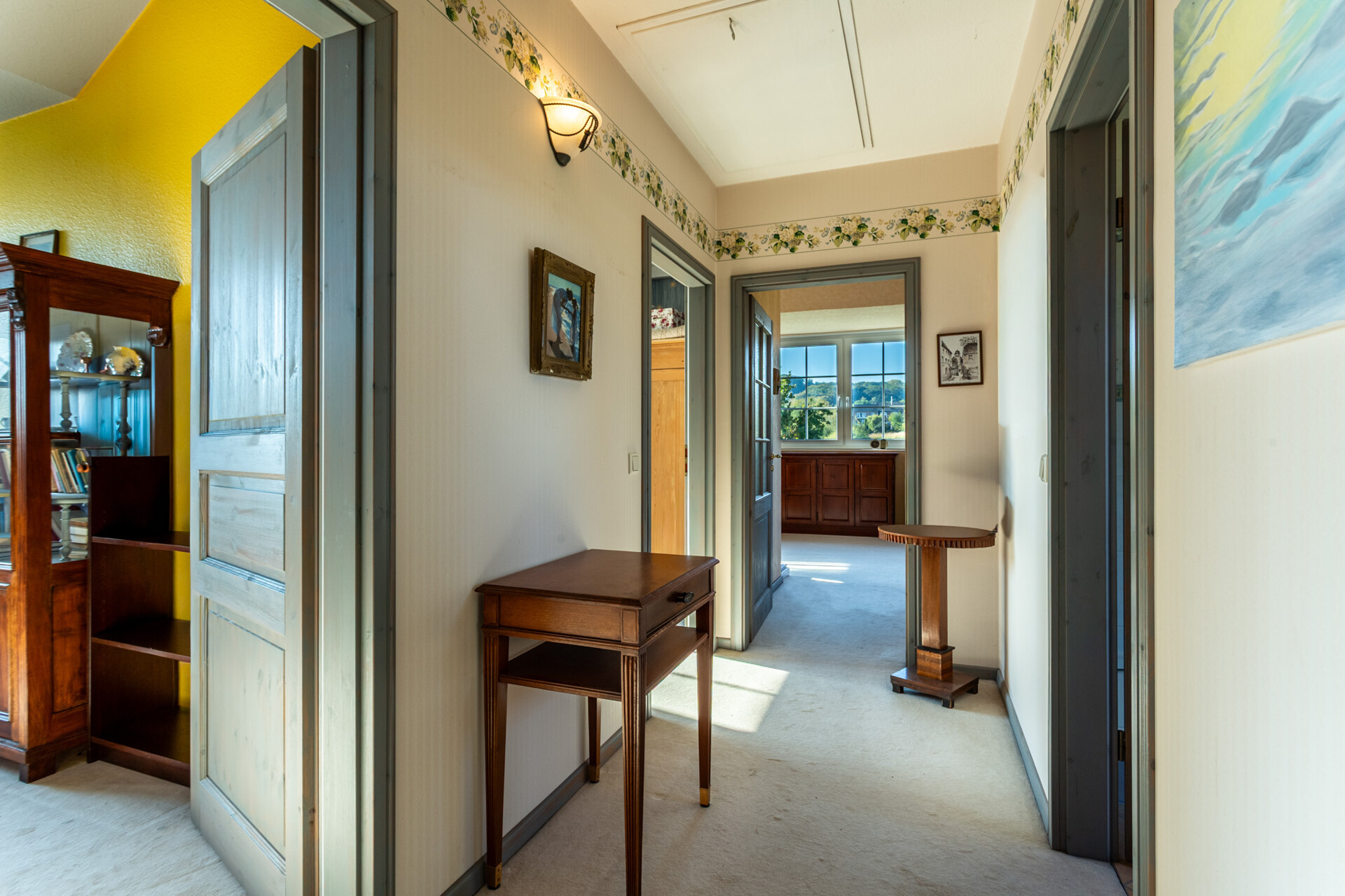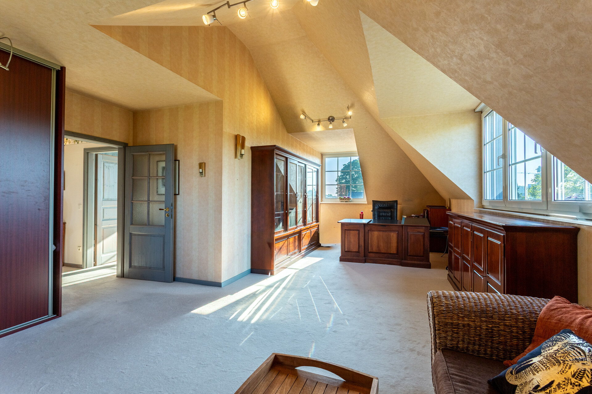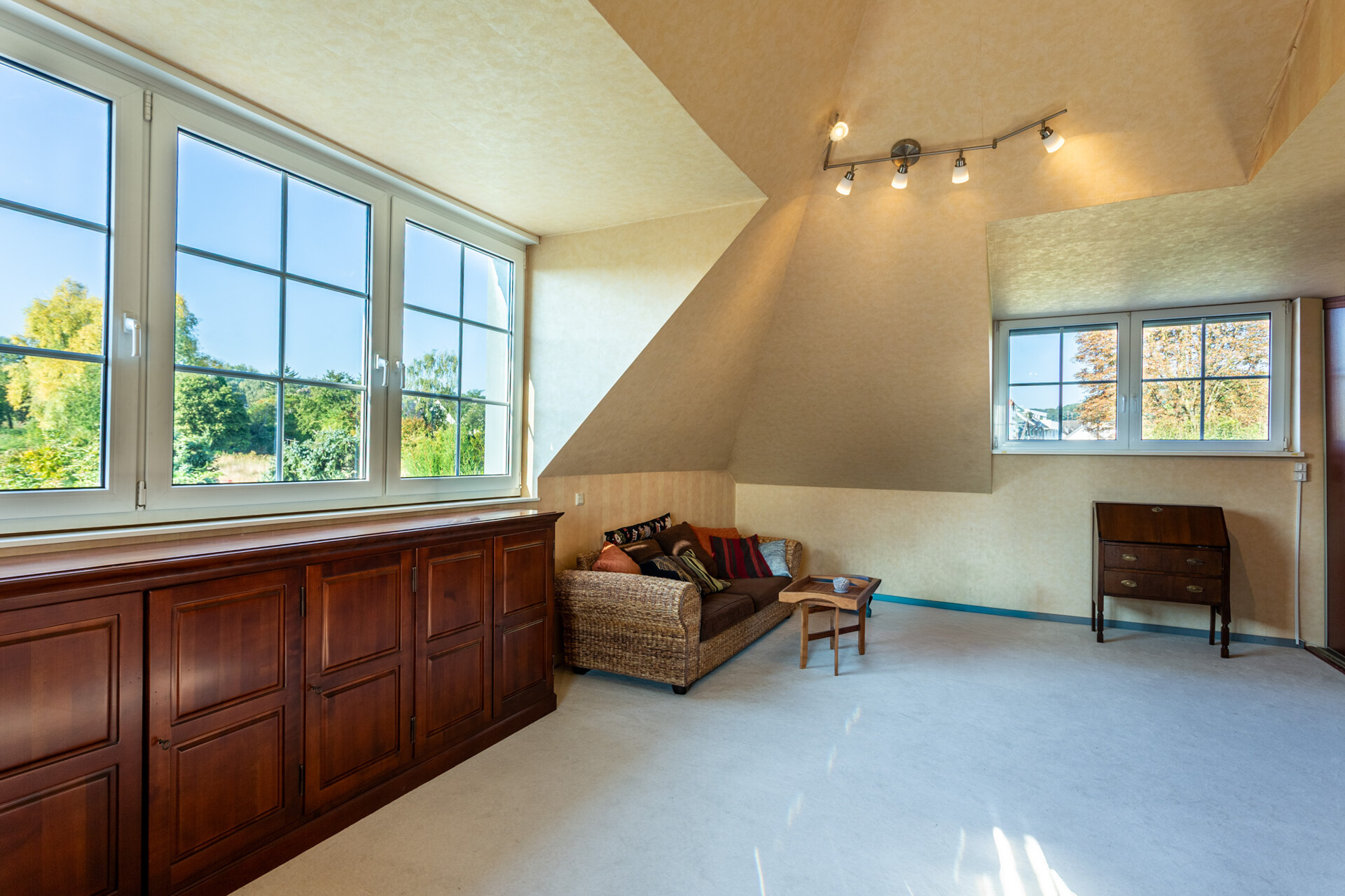 Die 2000 errichtete Aufstockung (heute Dachgeschoss) bietet drei weitere Zimmer und ein modernes Duschbad. Ideal als Kinder-, Arbeits- oder Gästezimmer – oder als eigenständige Wohneinheit, da Anschlüsse für Küche und Waschmaschine bereits vorhanden sind. Vom Dachgeschoss im Flur kann der Speicher erreicht werden. Dieser sorgt für zusätzlichen Stauraum.
