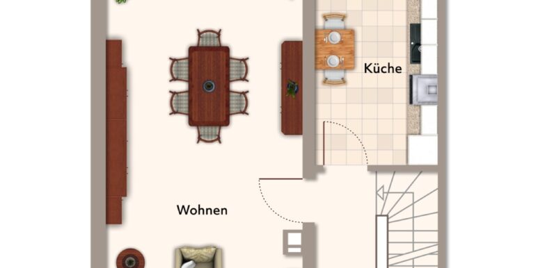 Beim Betreten des Hauses empfängt Sie ein heller Eingangsbereich mit einem praktischen Gäste-WC. Die Küche bietet ausreichend Platz für kulinarische Entfaltung und ist direkt mit dem großzügigen Wohn- und Esszimmer verbunden. Große Fenster sorgen für viel Tageslicht und schaffen eine freundliche Atmosphäre. Von hier aus gelangen Sie direkt auf die Terrasse mit Markise und Windschutz ein idealer Ort für entspannte Stunden im Freien.