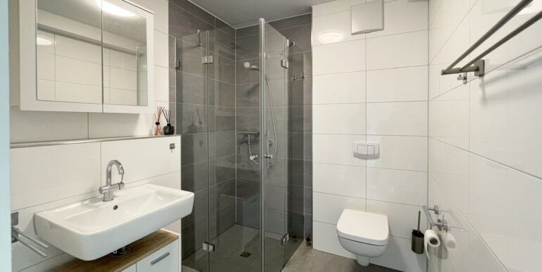 Das geräumige Badezimmer ist mit einer ebenerdigen Dusche ausgestattet und vollständig barrierefrei gestaltet. Hochwertige, pflegeleichte graue Fliesen wurden in der gesamten Wohnung verlegt und unterstreichen den modernen Charakter des Apartments.