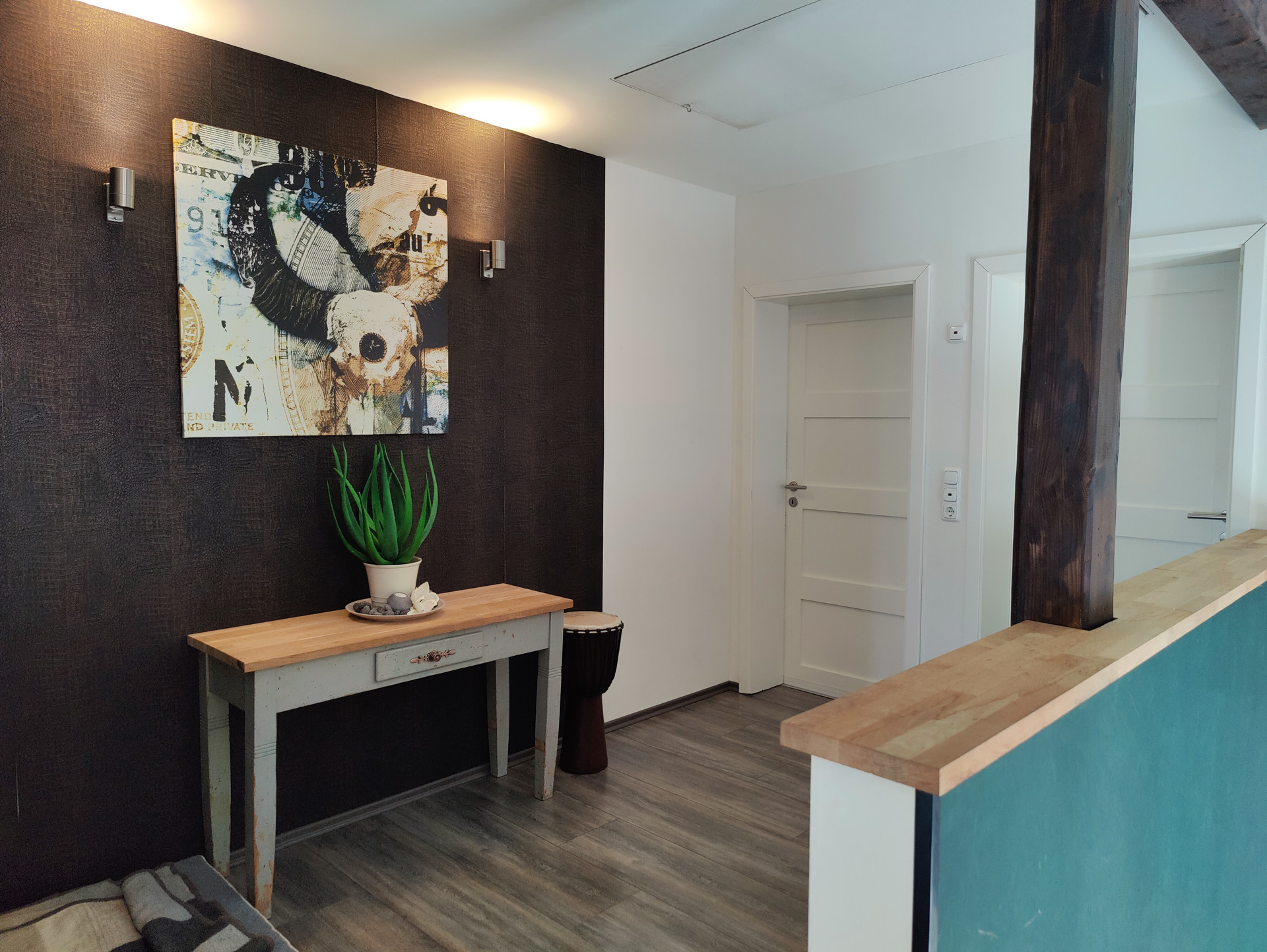 Die Doppelhaushälfte verfügt über ca. 188 m² Wohnfläche. Das Erdgeschoss ist offen gestaltet und bietet teilweise unverputzte Betondecken im Industrial Style. Auch der Rest des Hauses wurde geschmackvoll und modern hergerichtet. Vom Wohn- bzw. Esszimmer gelangt man auf eine riesige Außenterrasse und in den liebevoll angelegten Garten mit Gartenteich. Die Diele bietet einen freien Blick in die Galerie im OG. Beim Umbau wurde auf eine energieeffiziente Gestaltung geachtet. So wurden z.B. die Außenwände im EG mit einer zweiten Mauer und im EG und OG mit einer zusätzlichen Außendämmung versehen. Im Dach wurde der Dachboden gedämmt.