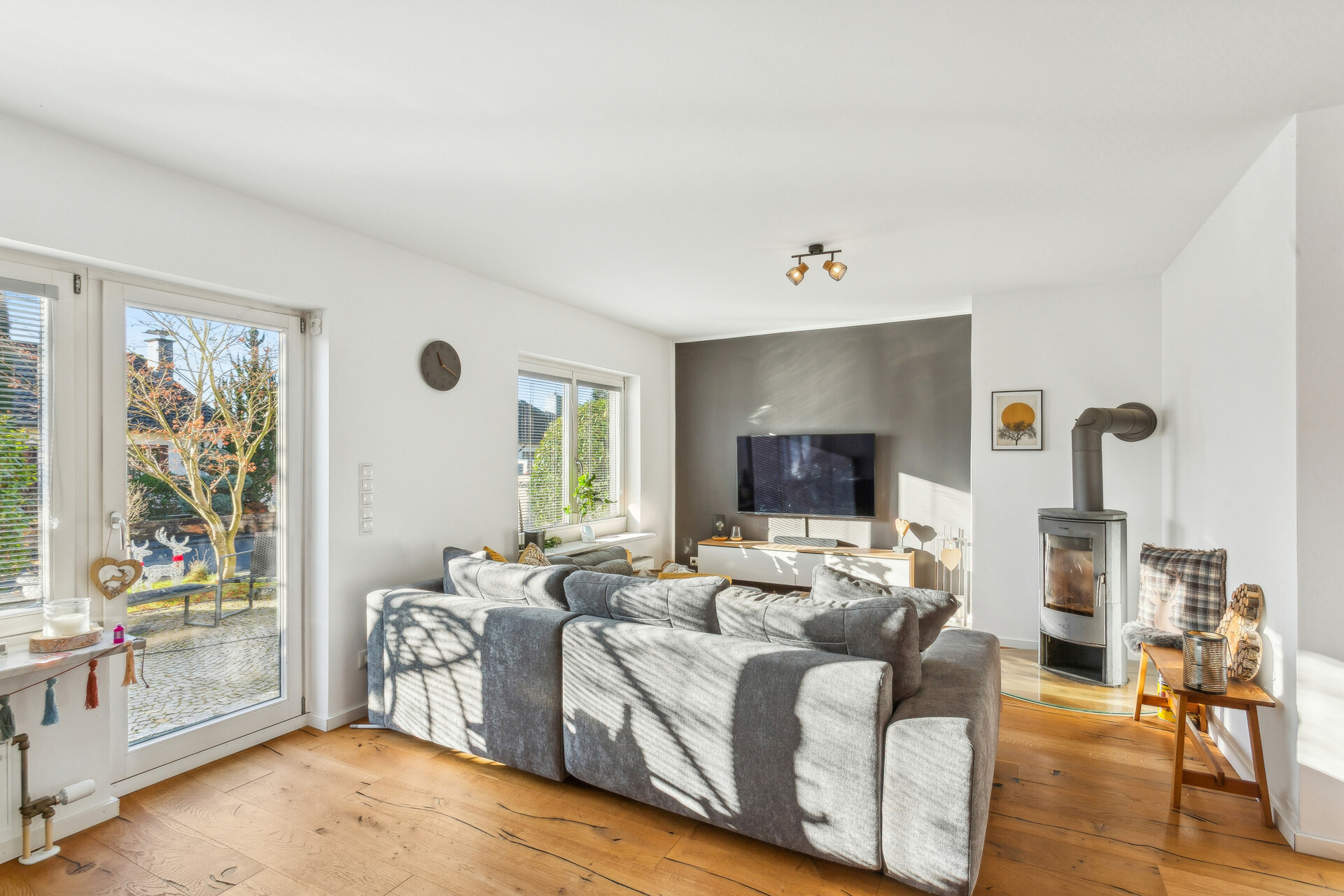 Beim Betreten des Hauses gelangt man in den einladenden Flurbereich, von dem aus alle Räume des Erdgeschosses erreichbar sind. Auf der linken Seite befindet sich ein Gäste-WC mit Tageslichtfenster, während sich geradeaus die Küche öffnet. Die hochwertige Einbauküche aus dem Jahr 2019 ist mit hochwertigen Elektrogeräten der Marken NEFF und Siemens ausgestattet und bietet außerdem direkten Zugang zur Terrasse und in den Garten. Auf der rechten Seite liegt der großzügige Wohn- und Essbereich, der durch einen Kamin und den verlegten Echtholzparkettboden ein gemütliches Wohnambiente schafft.