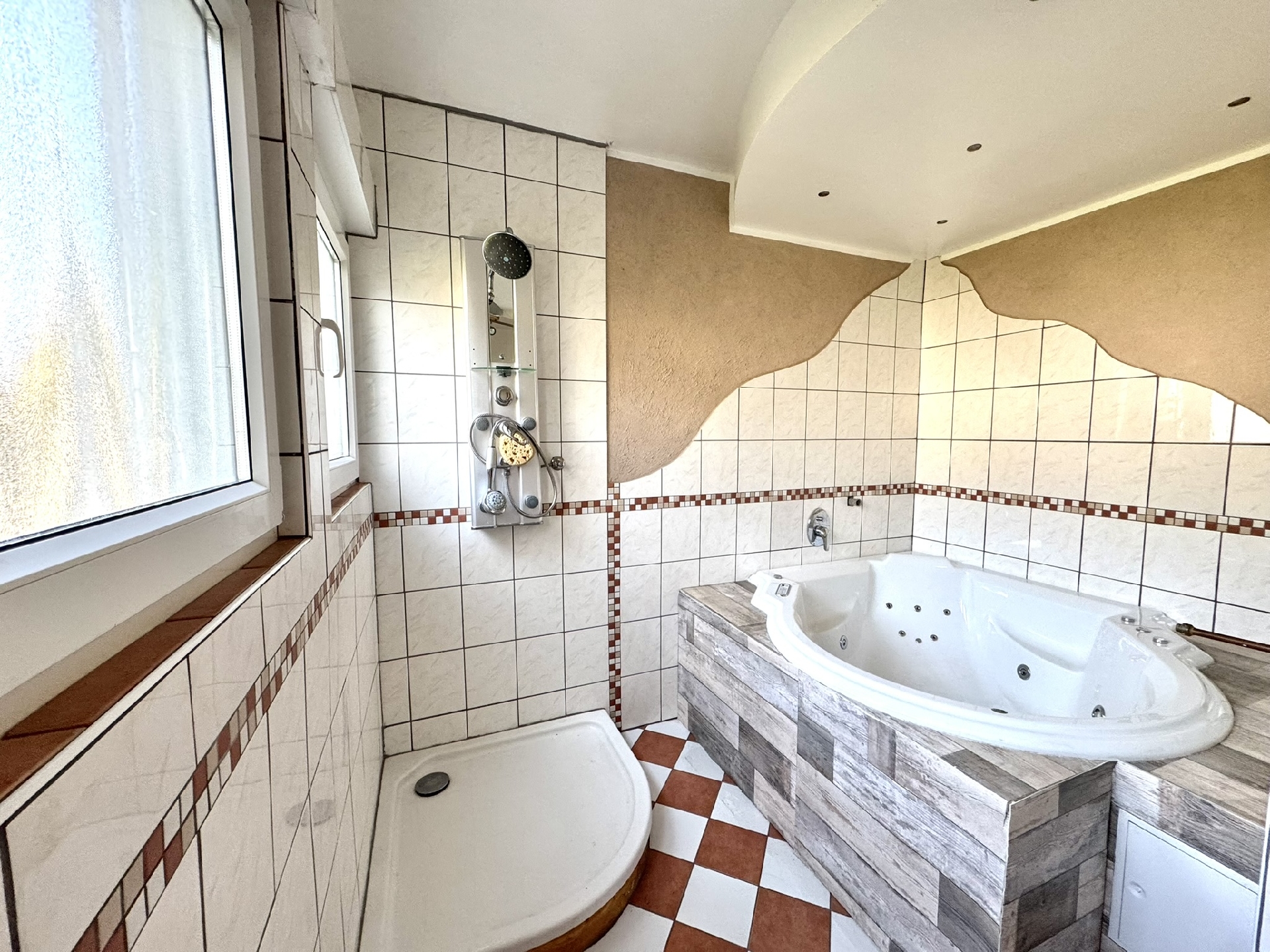 - Badausstattung: Dusche, Badewanne, Fenster im Badezimmer