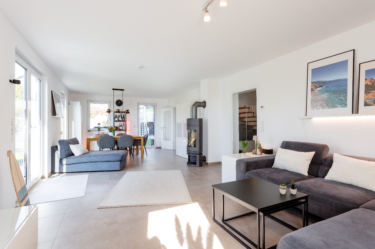 Helle großformatige Fliesen im gesamten Erdgeschoss
