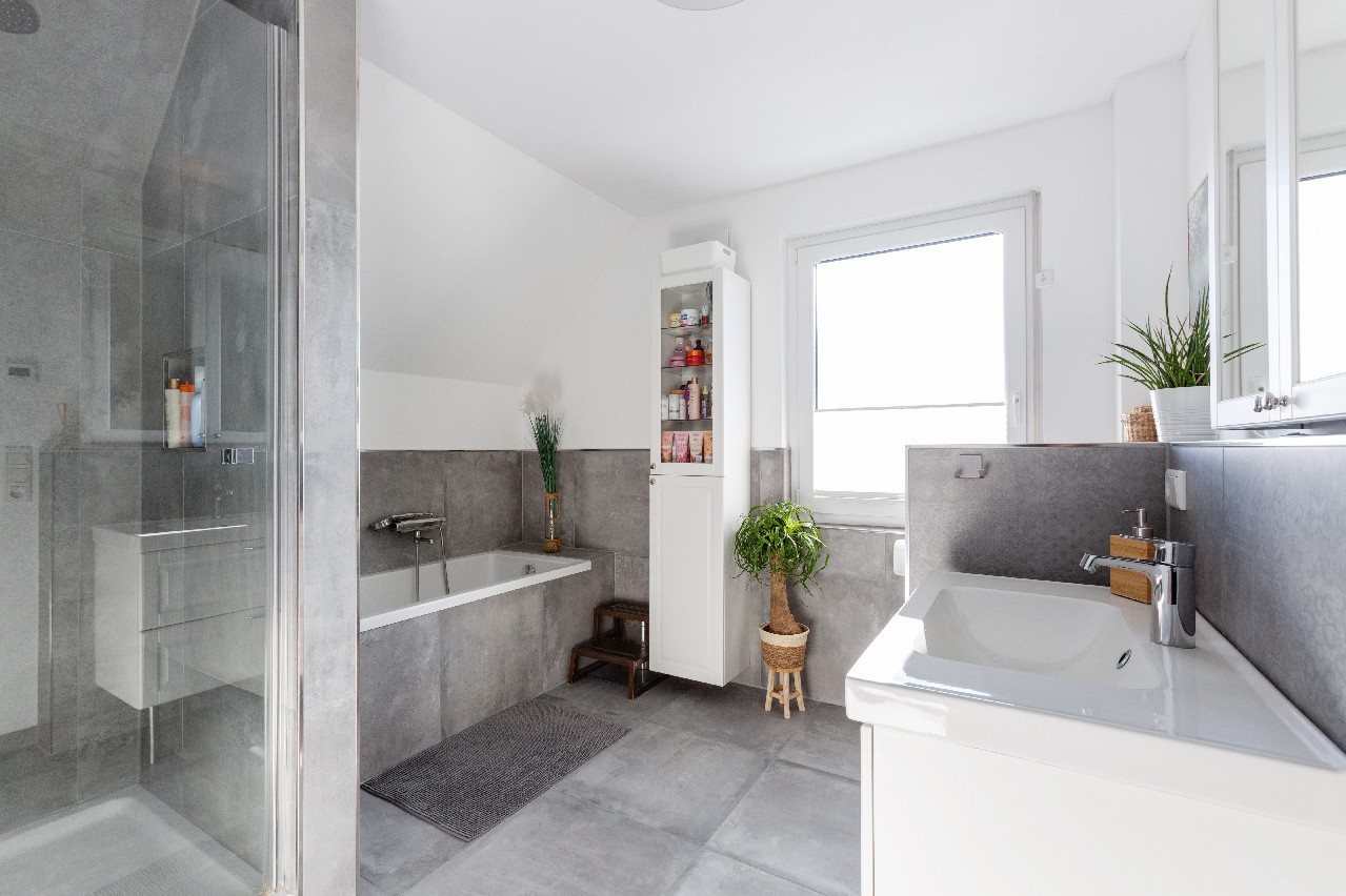 OG: Hellgrau gefliestes, geräumiges Badezimmer mit Fenster, einer Dusche und einer Badewanne, einem Waschtisch samt Unterschrank und einem optisch abgetrennten WC