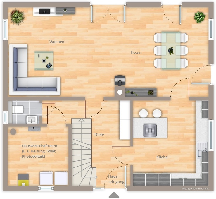 Auf ca. 139 m² Wohnfläche finden sich helle und gut geschnittene Räume, die durch große Fensterfronten lichtdurchflutet sind. Die großformatigen Fliesen in allen Wohnbereichen, die weißen Türen mit Zargen sowie die bodentiefen Fensteranlagen mit Rollläden verleihen dem Wohnbereich einen besonderen modernen Look. Die Küche ist sowohl von der Diele als auch vom Essbereich erreichbar. Eine funktionelle Einbauküche mit Kochinsel im Landhausstil könnte vom Erwerber übernommen werden. Somit kann das kulinarische Abenteuer im Haus sofort beginnen.