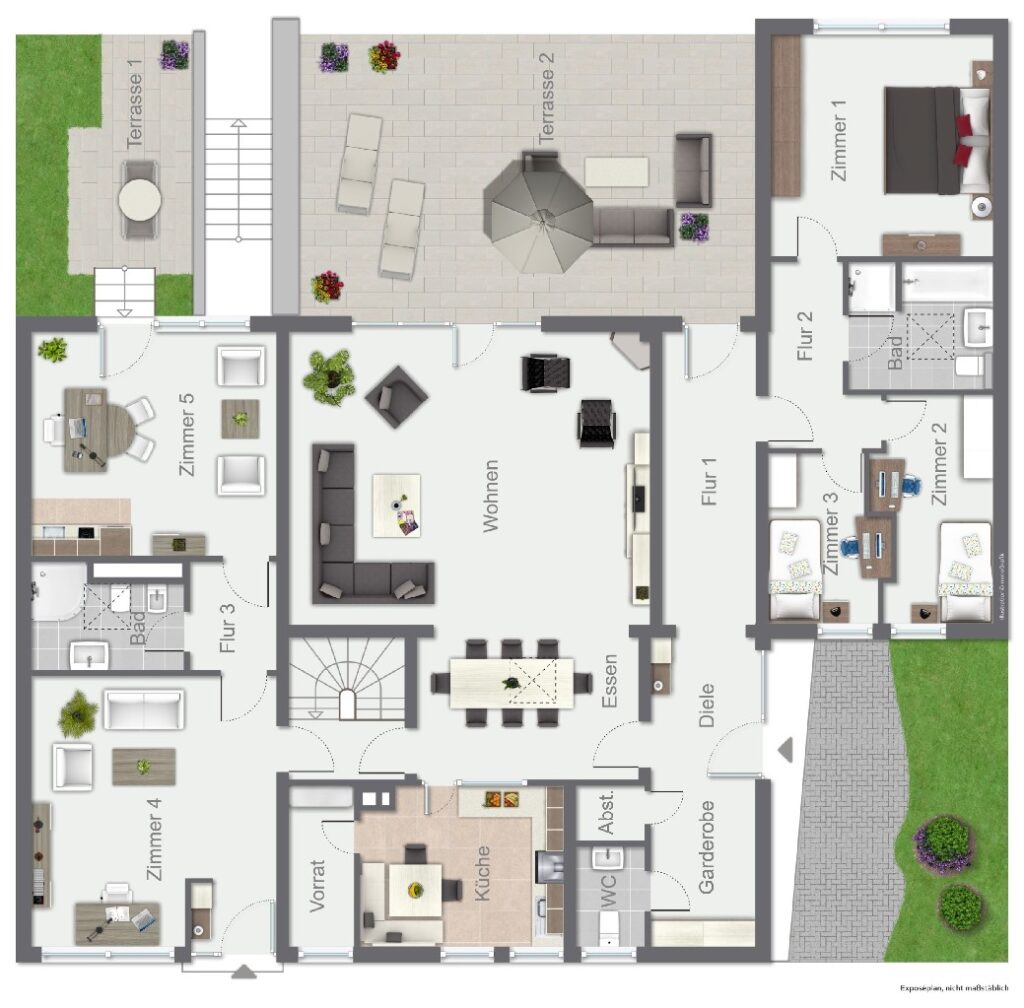 – großzügige Raumstruktur mit bis zu sechs möglichen Schlafräumen, ideal für Familien, Mehrgenerationenwohnen oder die Kombination von Wohnen und Arbeiten.