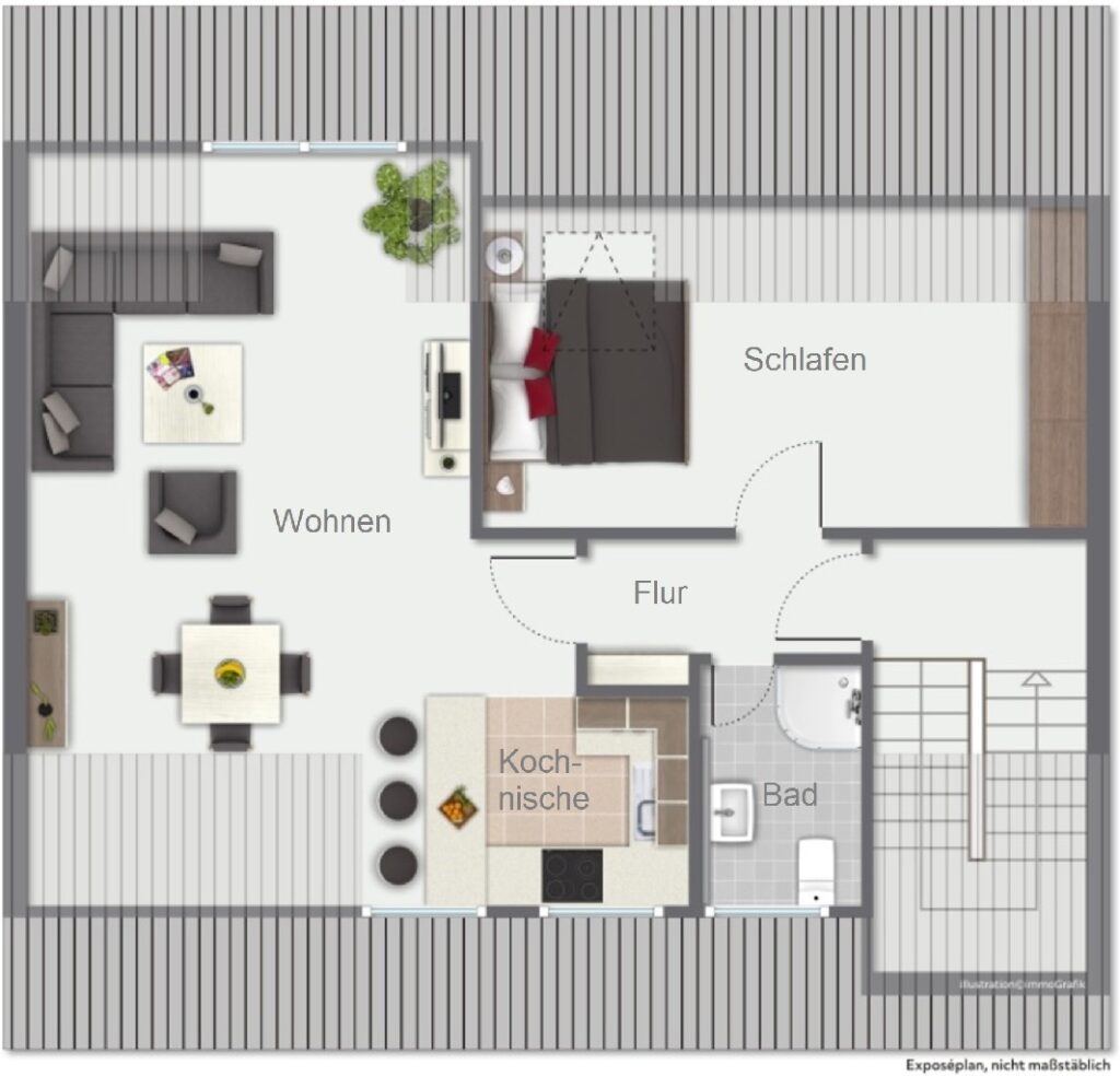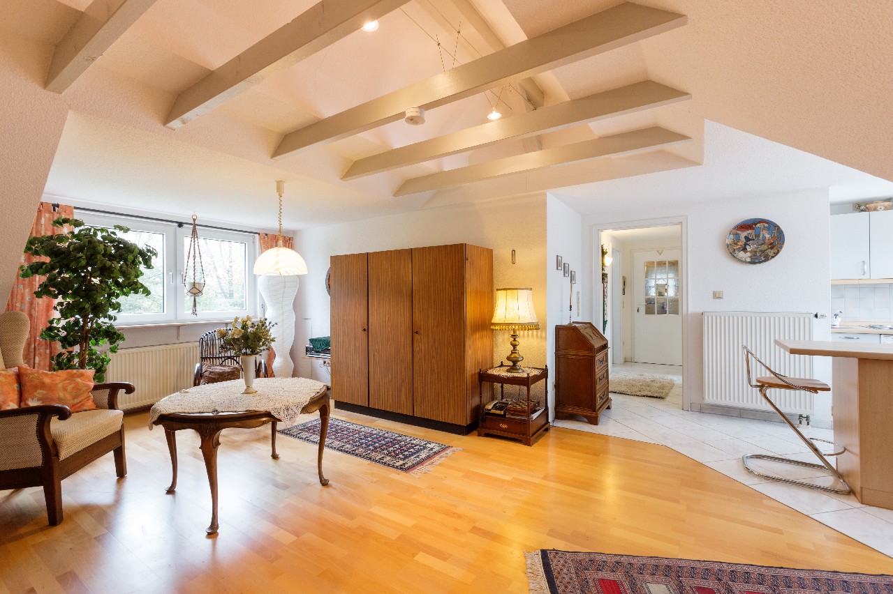 Das Dachgeschoss wurde 1997 wohnlich ausgebaut und zeigt sich hell und modern. Der ca. 32 m² große Wohn- /Essbereich mit Kochnische bietet mit seinen Schrägen eine tolle Atmosphäre. Ein Schlafraum sowie ein Duschbad runden das Flächenangebot auf dieser Ebene ab.