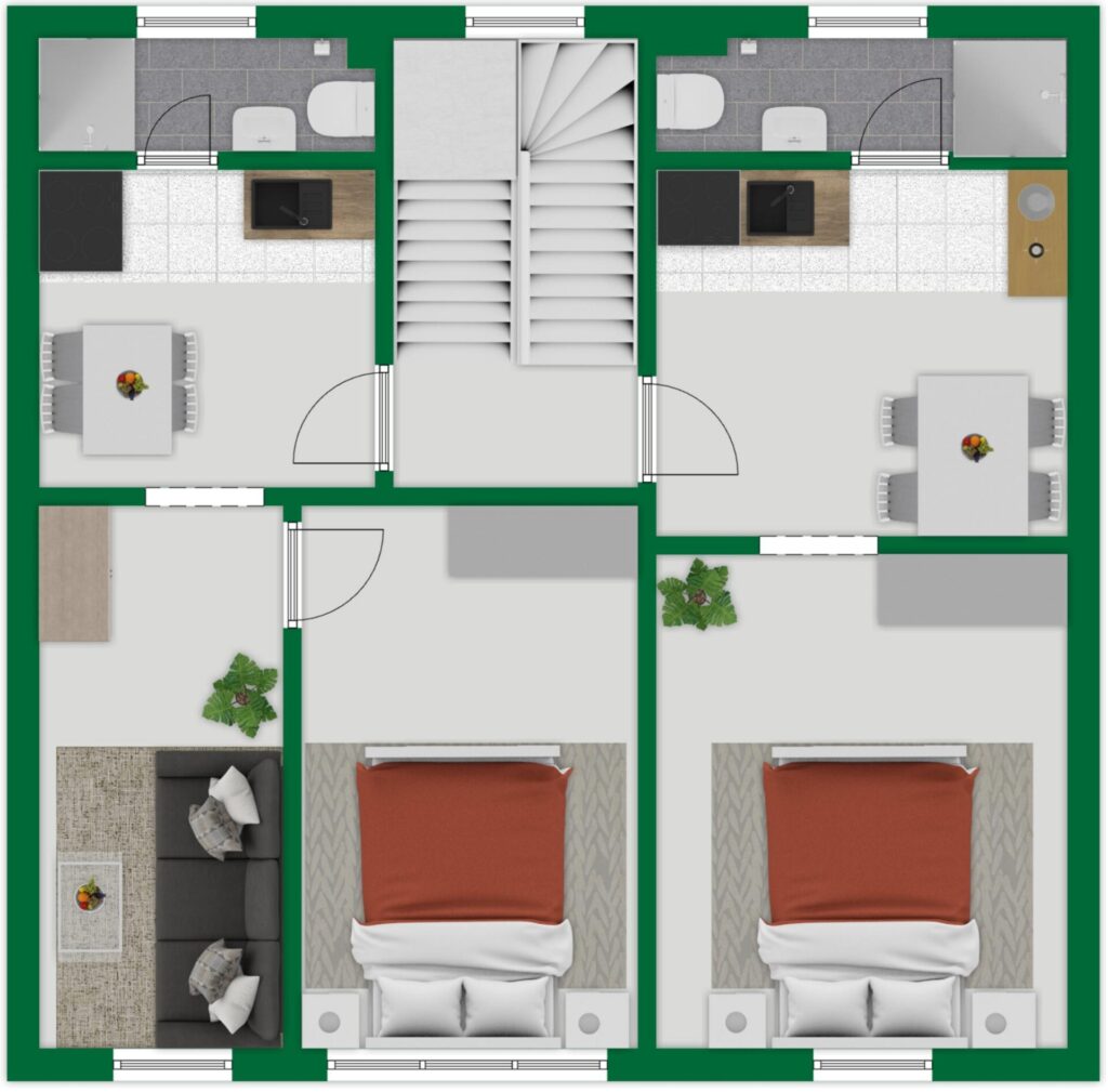 Die erste Einheit im Erdgeschoss ist eine charmante 2-Zimmer-Wohnung. Sie verfügt über einen Wohn- und Essbereich mit offener Küche sowie ein Schlafzimmer. Die Küche wurde frisch mit modernen Bodenfliesen ausgestattet.