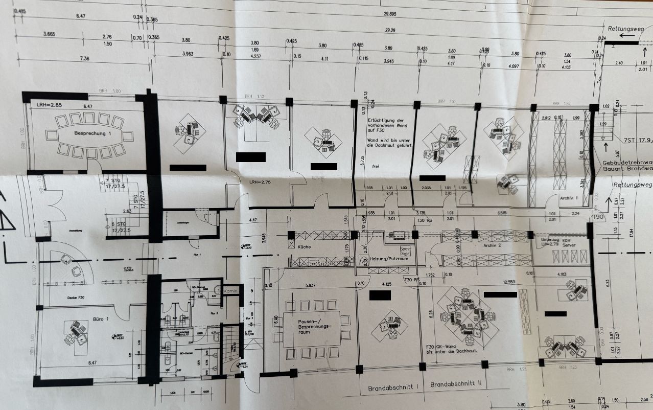 Sehr gepflegte, freistehende Büroimmobilie, 2 großzügige Empfangsbereiche, 13 Büros, 1 Großraumbüro, Büros teilweise mit Echtglasabtrennungen, hochwertige Teeküche mit Theke, weitere Teeküche, moderne WC-Anlagen, teilweise mit Tageslicht, 2 Aktenräume, 1x ca. 30m² großer Archivraum, klimatisierter Server-raum, 2 Gaszentralheizungen (teilweise BJ 2021), Fußbodenoberbeläge Fliesen und Teppich, teilweise Klimaanlagen, elektrische Rollläden mit Schattierung, DV-Verkabelung, Alarmanlage mit Fernaufschaltung möglich, Glasfaseranschluss, Kassettendecke mit integrierter Beleuchtung, Kunststofffenster mit Isolierverglasung, Dach gedämmt, Granitsteintreppe.