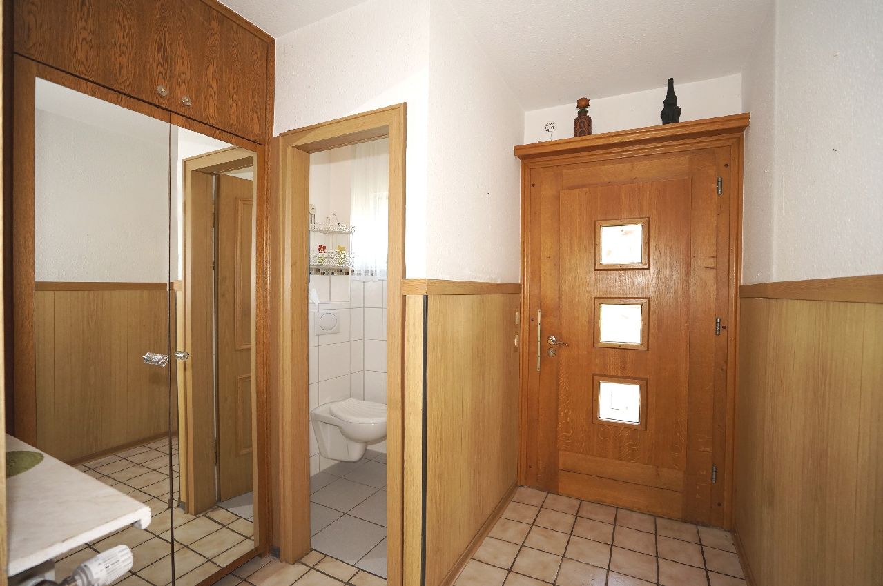 Sie erreichen das hier angebotene, familienfreundliche Reihenhaus vom Garagenplatz aus über einen kurzen Fußweg und einen kleinen Vorgarten. Am überdachten Hauseingang erwartet Sie eine besondere Hauseingangstüre und der Zugang in die klassische Eingangsdiele mit Garderobe und Gäste-WC.