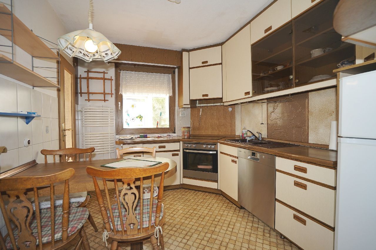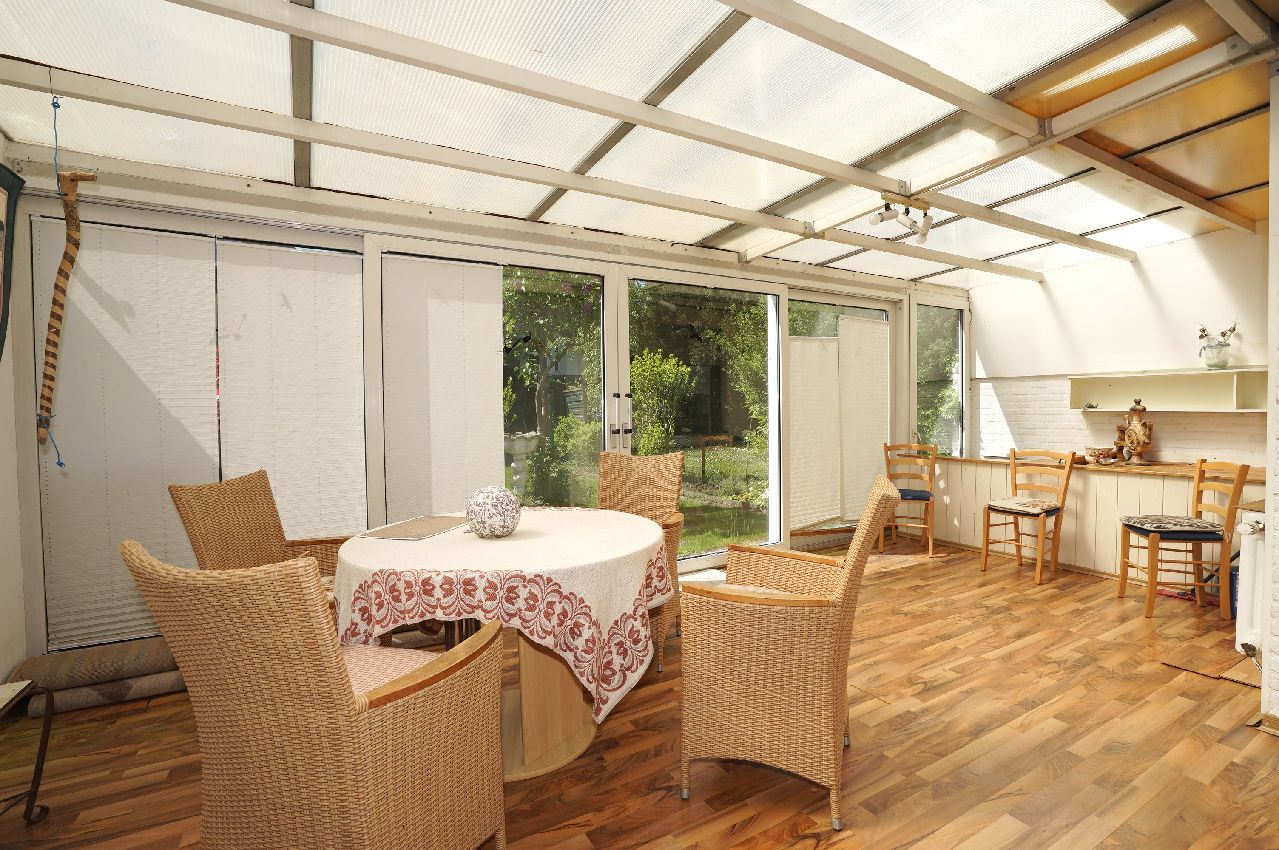 Als weitere Räume auf der Eingangsebene stehen die Küche und das Wohnesszimmer zur Verfügung. Zusätzlich wurde das Erdgeschoss im Jahr 2008 noch durch einen beheizbaren Wintergarten mit einer Grundfläche von knapp 25 m² erweitert, der als Besonderheit über je einen Zugang aus dem Wohnzimmer und aus der Küche verfügt. Die großen nach Südwesten ausgerichteten Fensterfronten der gartenseitigen Räume sorgen für eine sehr gute Ausleuchtung des gesamten Bereichs. In der Wohnflächenberechnung mit ca. 112 m² ist der Wintergarten nur mit 50% enthalten.