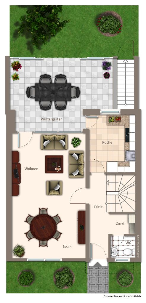 Grundrisse: Bei den in den Grundrissplänen (Prospektzeichnungen) eingezeichneten Möbeln und Ausstattungsgegenständen (z. B. Waschmaschine, Trockner, Sanitärausstattung, o. Ä.) handelt es sich um Einrichtungs- und Gestaltungsvorschläge, die nicht mit den vor Ort vorhandenen Gegebenheiten übereinstimmen müssen. Sie sind kein Bestandteil des Angebotes, und somit ohne konkreten Hinweis nicht im Kaufpreis enthalten. Sie dienen lediglich der Darstellung der Lage und ungefähren Größe der Räumlichkeiten. Für eventuell eingetragene Maße übernehmen wir keine Gewähr.