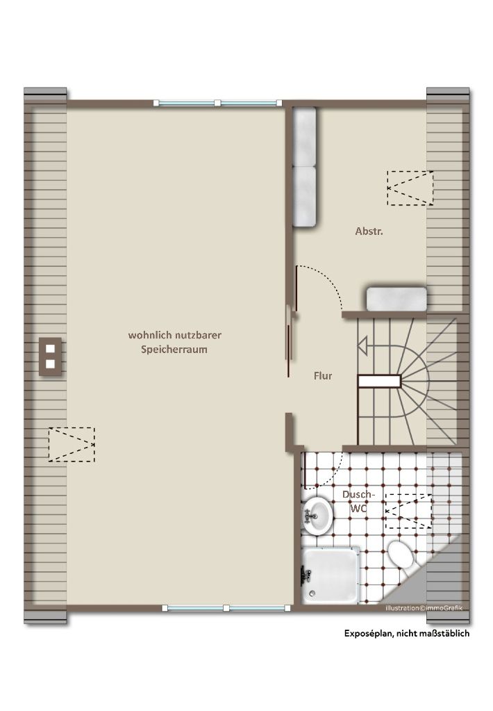 Die Einbindung der Nutzung des Dachgeschosses steht Ihnen offen und bietet je nach Bedarf und Personenzahl des Haushaltes flexible Möglichkeiten. Beide Giebelseiten verfügen über Fenster und zusätzlich sind noch weitere Dachflächenfenster auch im Abstellraum und im Dusch-WC vorhanden. Änderungen der Grundrissaufteilung sind leicht möglich.