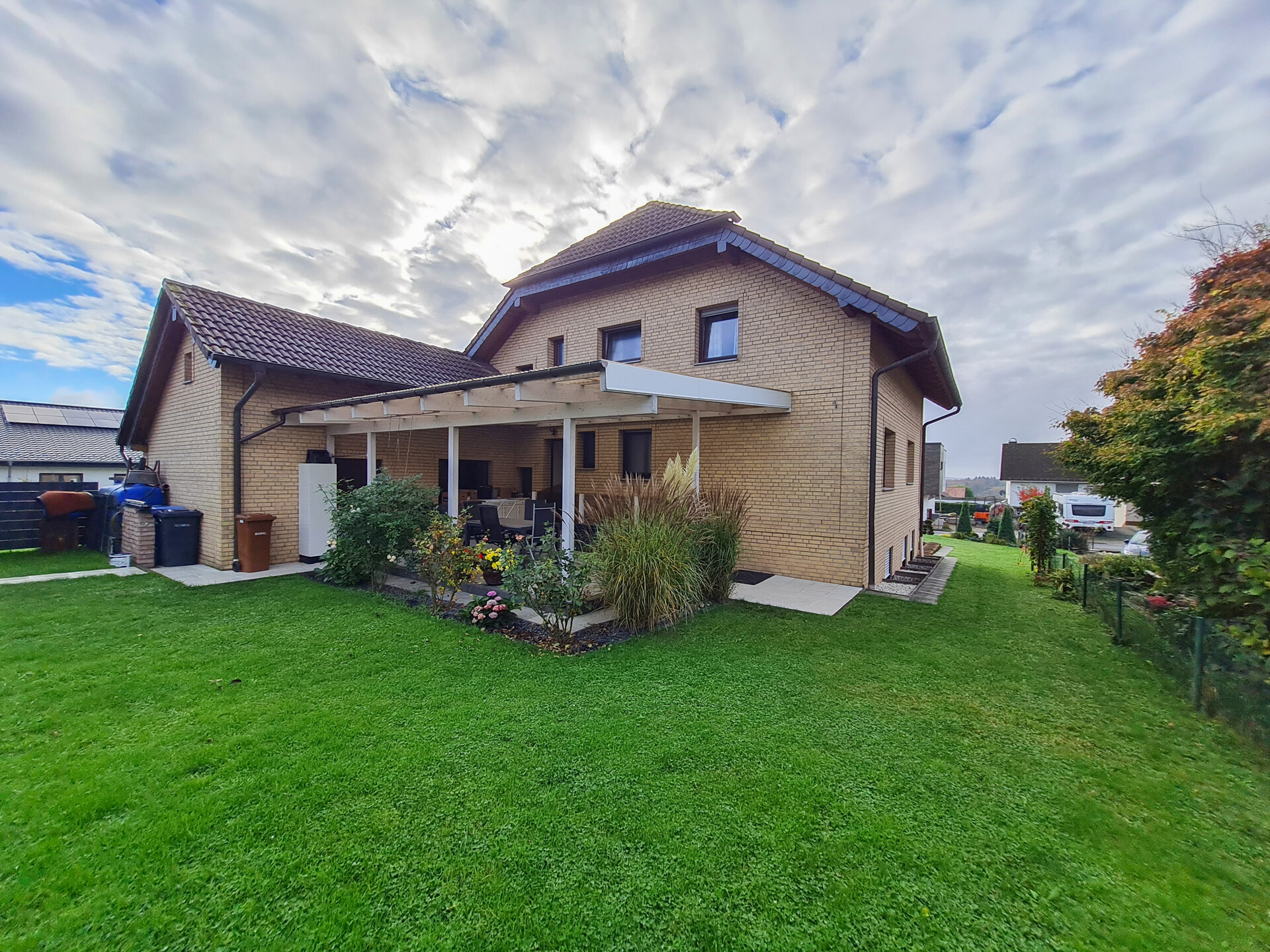 Das Grundstück von ca. 695 m² ist eingezäunt und pflegeleicht angelegt. Im hinteren Gartenbereich befindet sich ein Gartenhaus und dort ist auch ein Nutzgarten, teils auch mit Sträuchern angelegt. Zudem lädt eine große, überdachte Terrasse zum gemütlichen Verweilen ein.