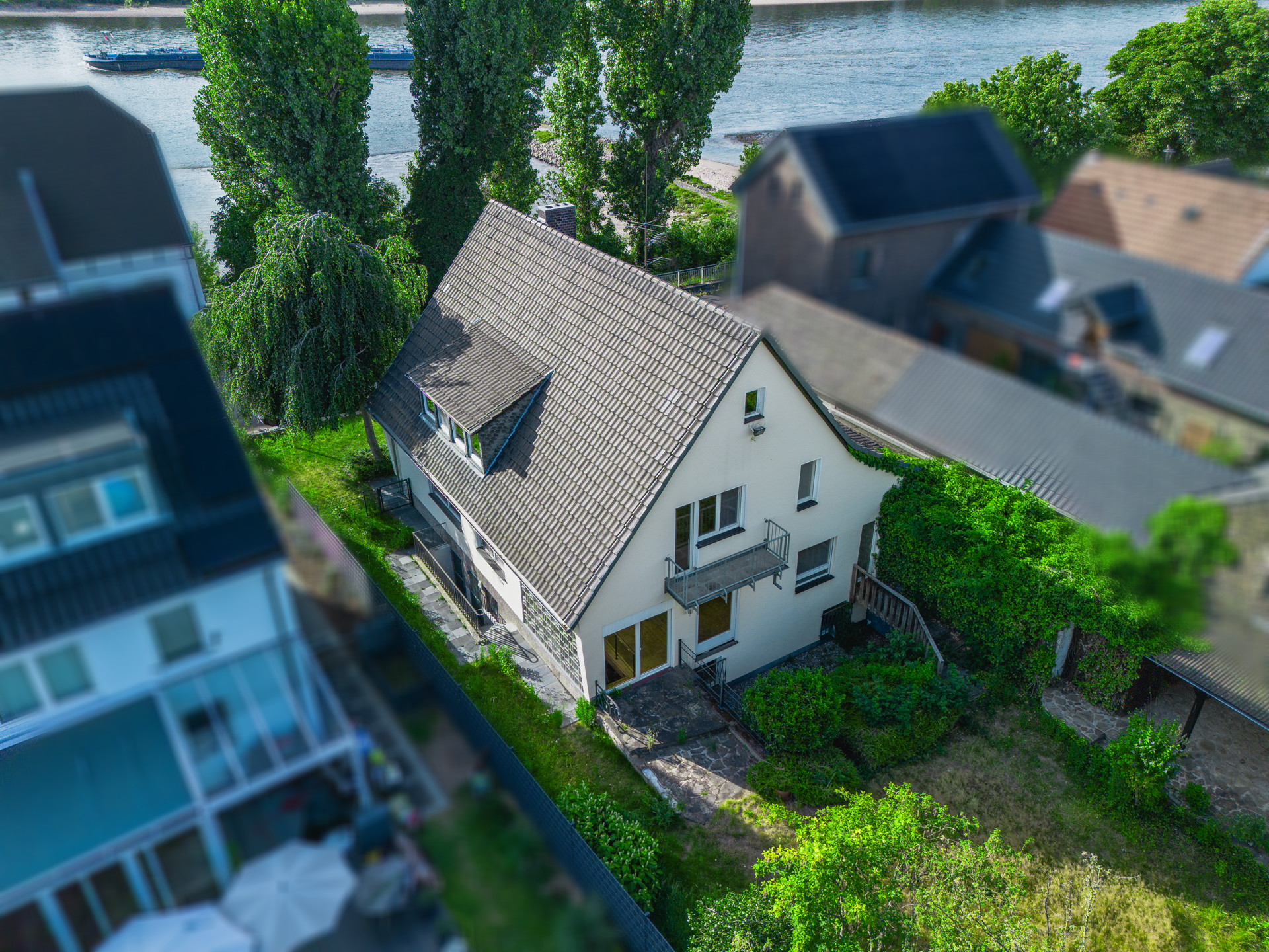 Das Einfamilienhaus befindet sich in Köln-Langel, einem ruhigen und naturnahen Ortsteil im rechtsrheinischen Süden der Domstadt. Gelegen an der Rheinbergstraße, überzeugt die Lage durch unmittelbare Nähe zum Rhein – mit Spazier- und Radwegen direkt vor der Haustür sowie einer seltenen Kombination aus Wasserlage und gewachsener Nachbarschaft.