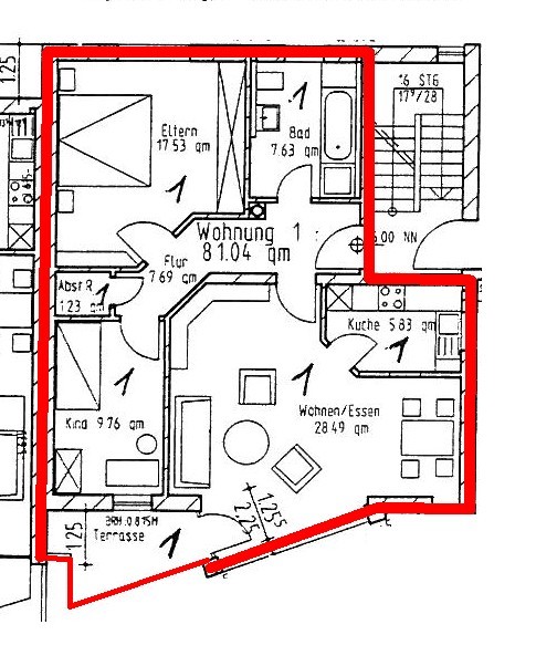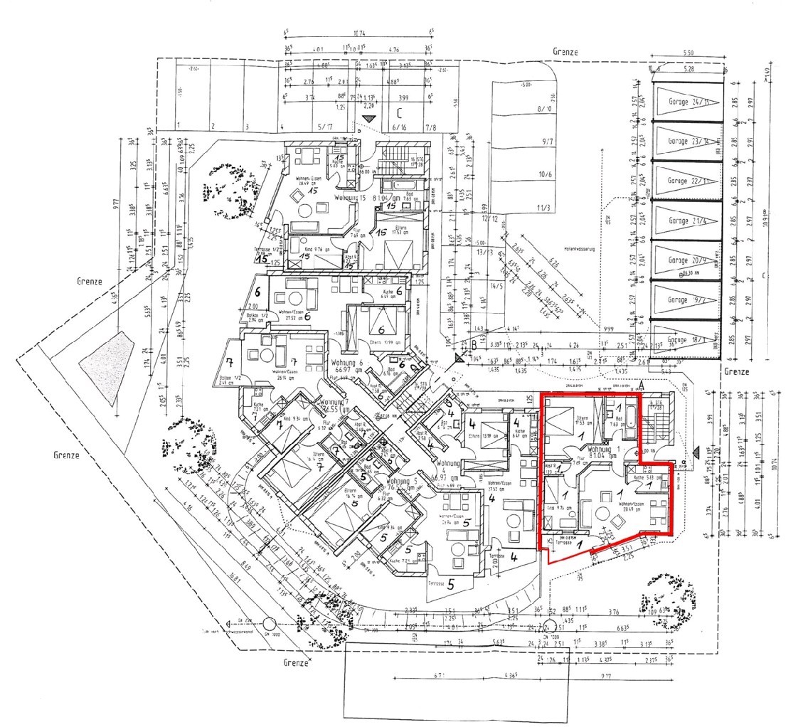 Die Wohnung ist aufgeteilt in Wohn-/Esszimmer, Schlafzimmer, Kinderzimmer, Küche, Bad mit Dusche und Wanne, Abstellraum. Ein Kellerraum und eine Garage gehört ebenfalls zur Wohnung.