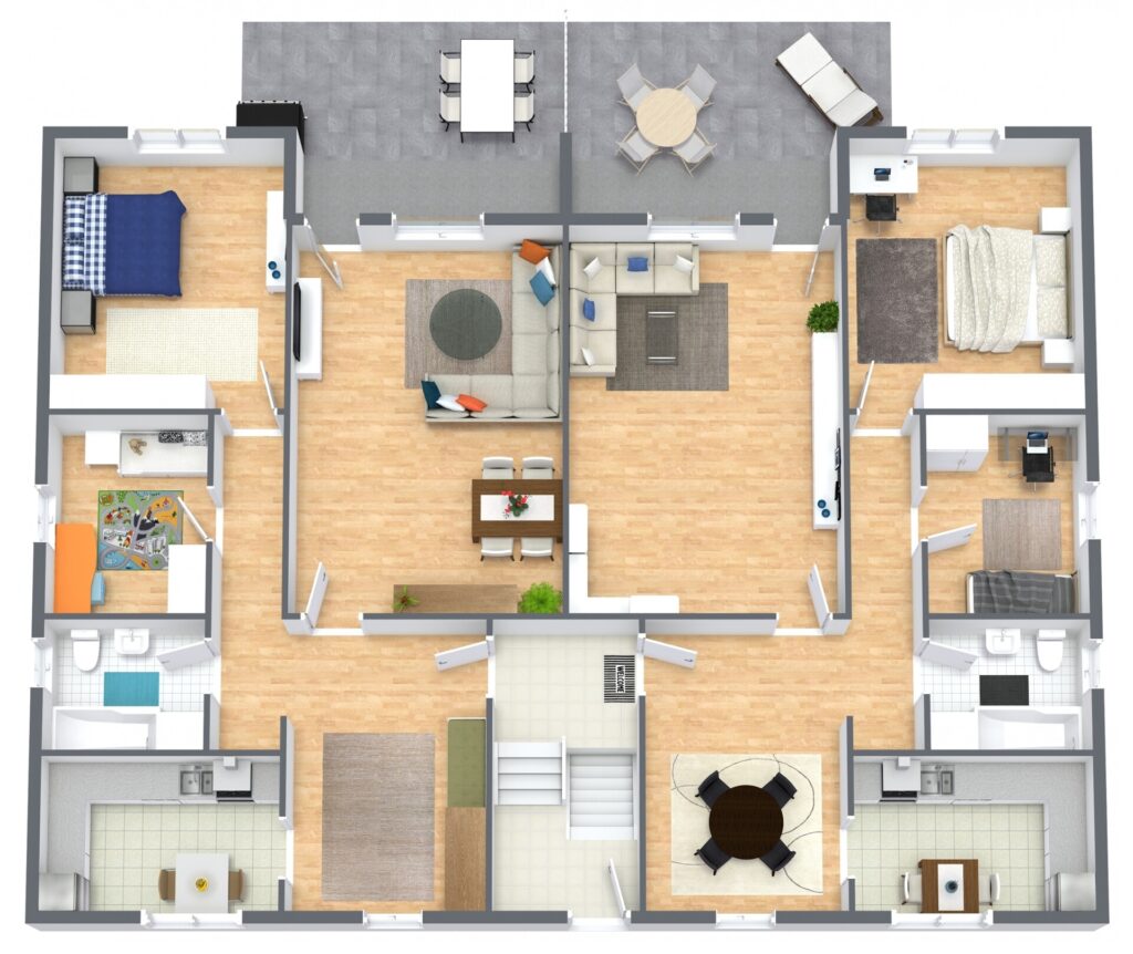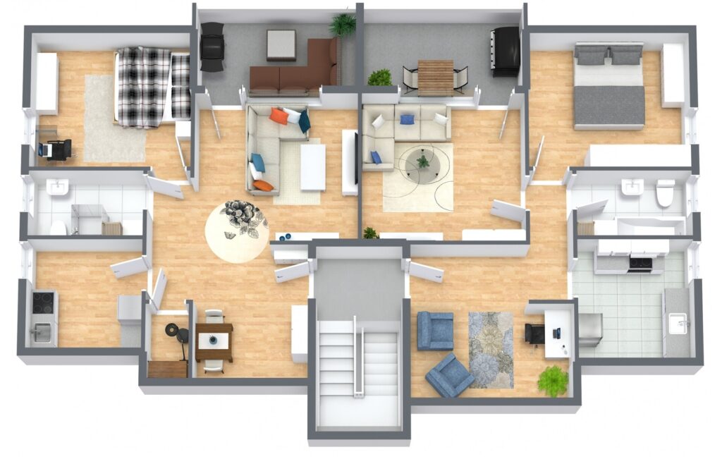 Die Gesamtwohnfläche beträgt ca. 435,33 m² und verteilt sich auf vier 3-Zimmer-Wohnungen sowie zwei 2-Zimmer-Wohnungen. Sämtliche Einheiten verfügen über funktionale Grundrisse mit gut nutzbaren Raumgrößen und sind überwiegend mit Balkonen oder Terrassen ausgestattet. Die beiden Erdgeschosswohnungen bieten jeweils einen direkten Zugang zu Terrassen, während die oberen Wohneinheiten über Balkone verfügen. Die Wohnungen im Dachgeschoss profitieren von einer angenehmen Raumhöhe und einer guten Belichtung.