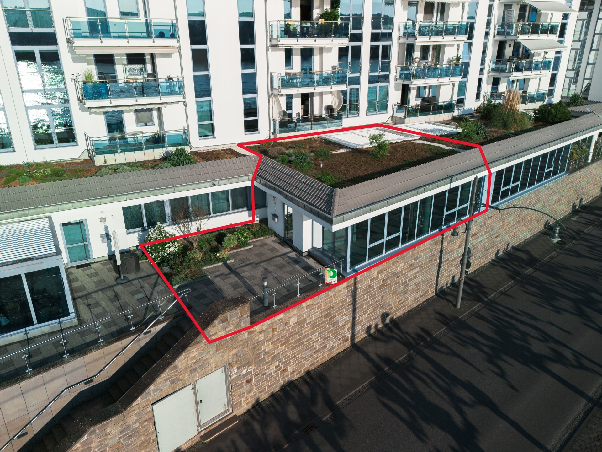 Die zum Rhein ausgerichtete Terrasse ist direkt über den Hauseingang zugänglich und bietet einen exklusiven Platz im Freien, um die Weite des Wassers zu genießen oder den Abend in entspannter Atmosphäre ausklingen zu lassen.