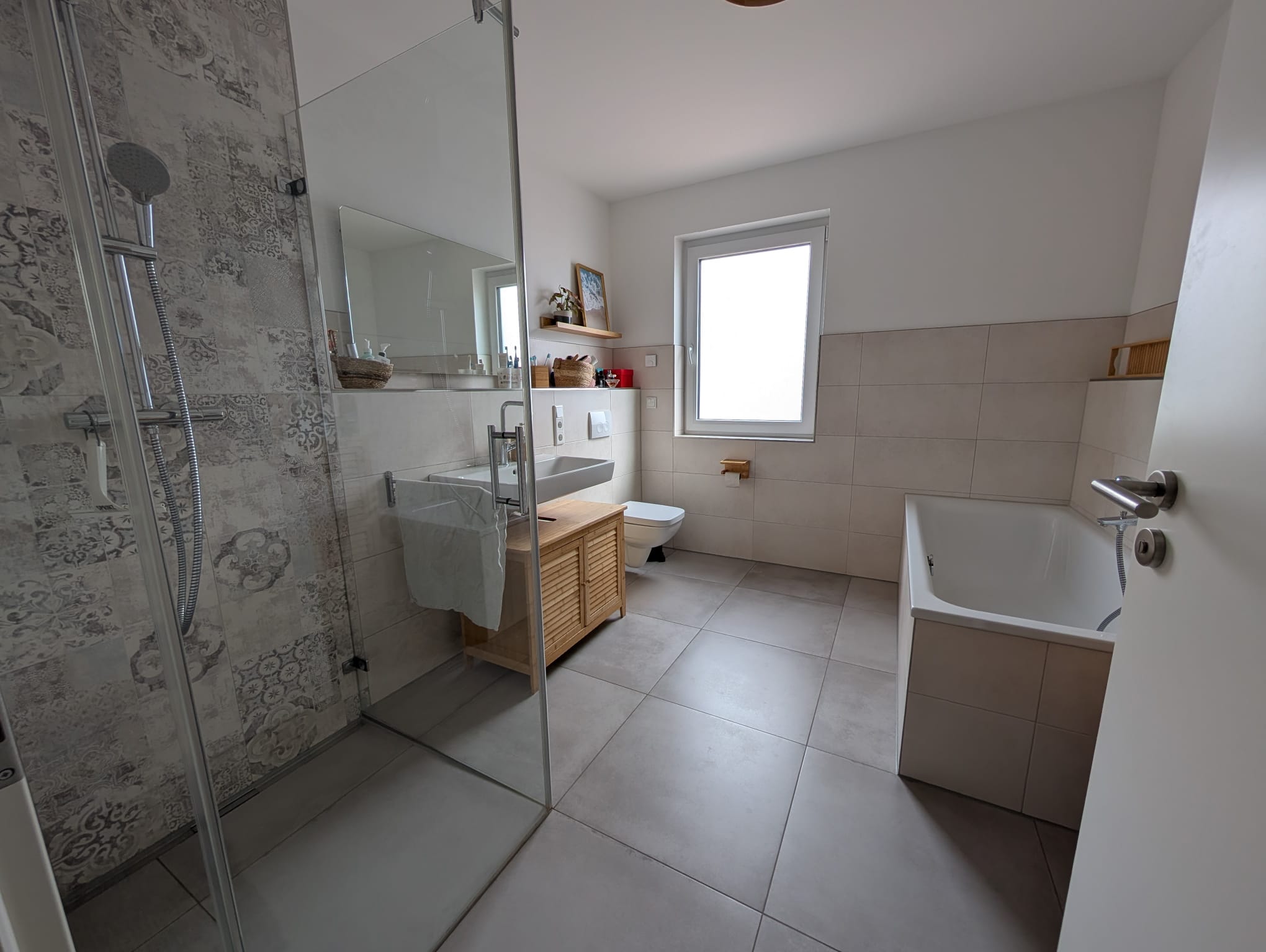 - Badausstattung: Dusche, Badewanne, Fenster im Badezimmer