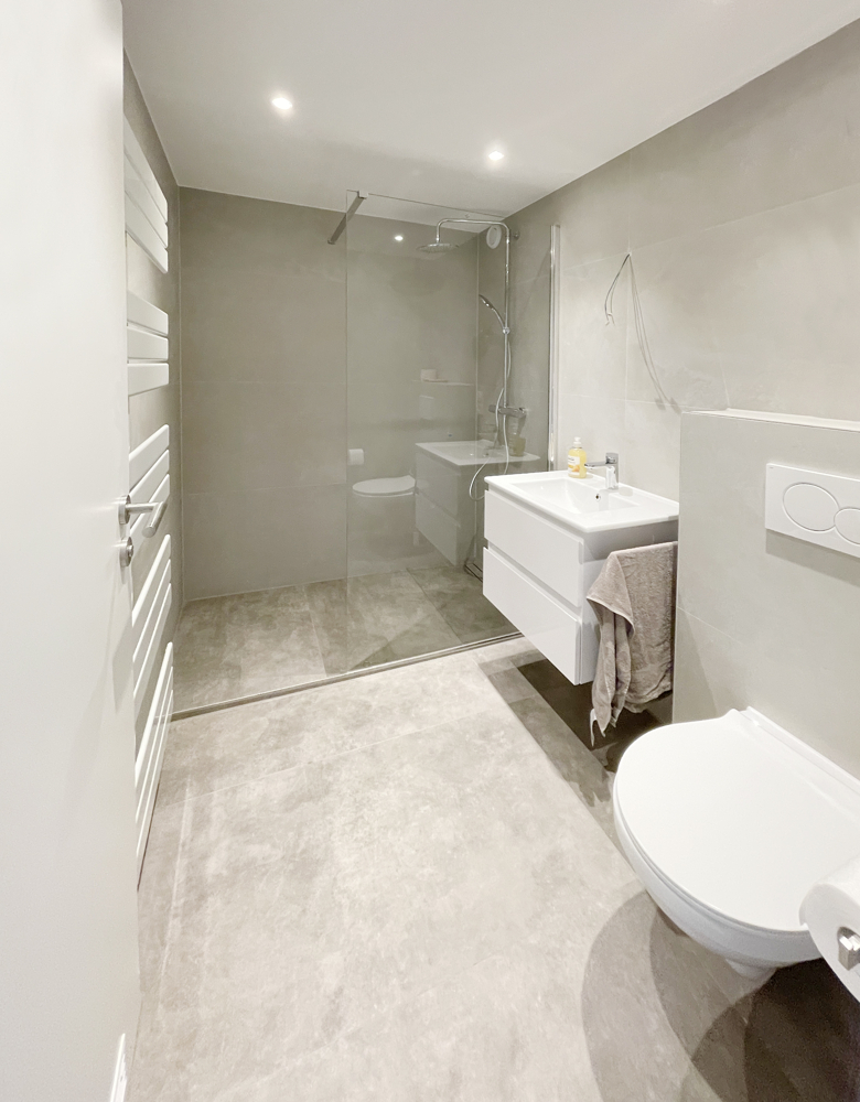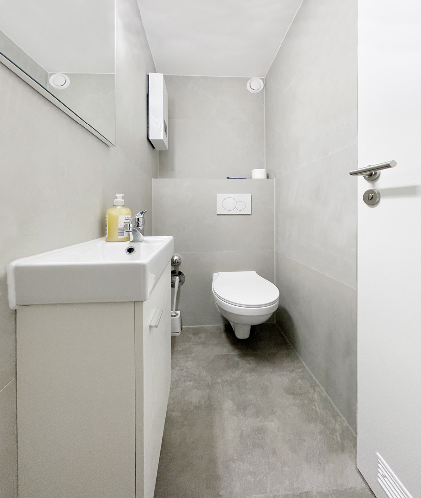 Für das innenliegende Gäste-WC und Duschbad wurden Fliesen in Betonoptik gewählt sowie mit Badmöbeln und Einbauspots ausgestattet. Die große Dusche bietet mit niedrigem Einstieg komfortablen Zugang. Eine feststehende Glastrennwand dient als Spritzschutz. Der elektrische Handtuchhalter sorgt sowohl im Winter und wenn nötig auch Sommer für wohlige Wärme.