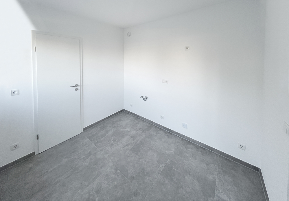Die Küche ist ebenfalls mit grauen Fliesen in Betonoptik versehen und hat eine praktische Speisekammer, in dem Vorräte und Alltagsgegenstände Platz finden. Vom großen Wohnzimmer aus haben Sie Zugang zum nach Westen ausgerichteten Balkon mit Abendsonne. Auch hier können Sie es sich so richtig gemütlich machen. Das Elternschlafzimmer und das Kinderzimmer bieten jeweils genug Platz für Ihre Möbel. Im Flur wurde praktischerweise ein Einbauschrank integriert, der viel Stauraum bietet.
