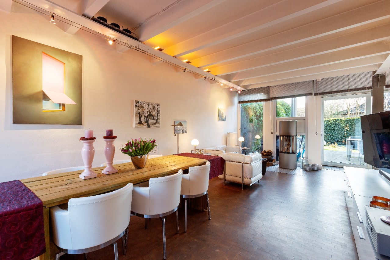Ein besonderer Pluspunkt ist die offen gestaltete Erdgeschossebene, die Wohnen, Essen und Kochen zu einem harmonischen Lebensmittelpunkt verbindet. Der Wohn- und Essbereich wirkt durch die großzügige Raumaufteilung und die Fensterflächen hell und freundlich. Der integrierte Kaminofen unterstreicht das gemütliche Wohnambiente und schafft besonders in der kalten Jahreszeit eine behagliche Atmosphäre. Von hier aus eröffnet sich ein schöner Blick in den Garten eine gelungene Verbindung von Innen- und Außenbereich.