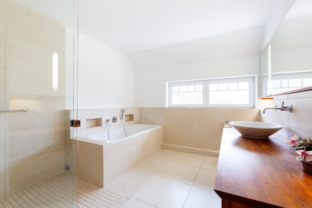 – modernes Bad mit Wanne, bodengleiche Dusche, Fenster und großem Spiegel