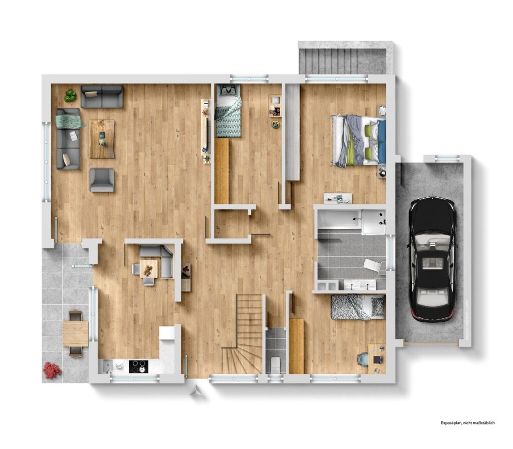Das Erdgeschoss des Hauses ist besonders geräumig und bietet ausreichend Platz für individuelle Gestaltungsmöglichkeiten und verfügt über 4 Zimmer, ein Hauptbad sowie ein Gäste WC. Ein großzügiges Wohnzimmer bildet das Herzstück des Hauses und lädt zu gemütlichen Stunden mit Familie und Freunden ein. Von hier aus gelangen Sie auf die Terrasse, die sich perfekt für entspannte Sommerabende eignet.