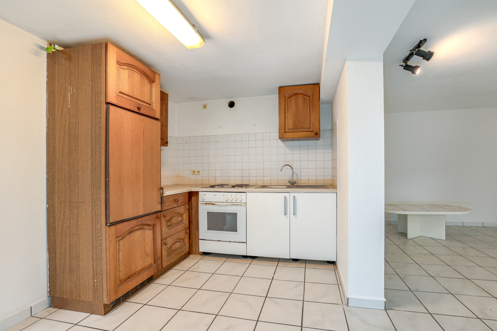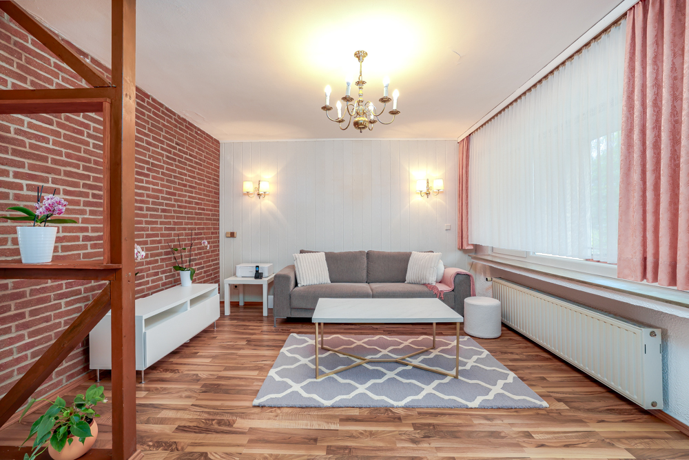 Im Erdgeschoss erwartet Sie eine offene und gemütliche Raumaufteilung. Die Küche ist durch einen rustikalen Türbogen aus Backsteinen vom angrenzenden Esszimmer getrennt ist. Der charmante Backstein-Stil setzt sich an einer Wand des Esszimmers fort und verleiht dem Raum eine warme und behagliche Atmosphäre. Vom Esszimmer aus gelangen Sie durch einen weiteren offenen Bogen in das helle, großzügige Wohnzimmer. Hier haben Sie Zugang zu einem Balkon, der einen schönen Blick auf den Garten bietet und viel Tageslicht hereinlässt. Zusätzlich gibt es auf dieser Ebene ein weiß gefliestes Badezimmer sowie ein weiteres Zimmer, das flexibel als Schlafzimmer, Arbeitszimmer oder Gästezimmer genutzt werden kann.