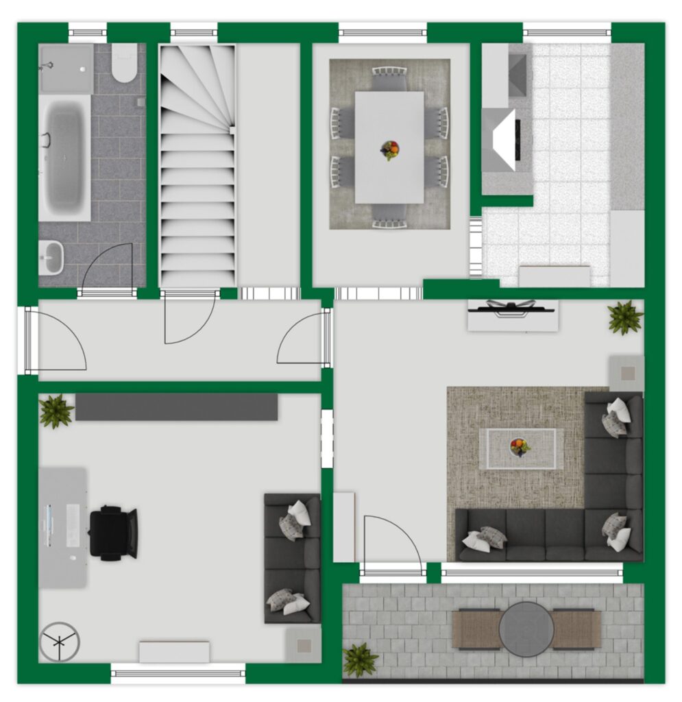 Über ein paar Stufen gelangen Sie zur Eingangstür, die durch das schützende Vordach bei jedem Wetter einen trockenen Zugang zum Haus bietet. Die Überdachung verleiht dem Eingangsbereich zusätzlich einen einladenden Charakter und bietet auch Raum für dekorative Elemente, um Gäste stilvoll zu empfangen.