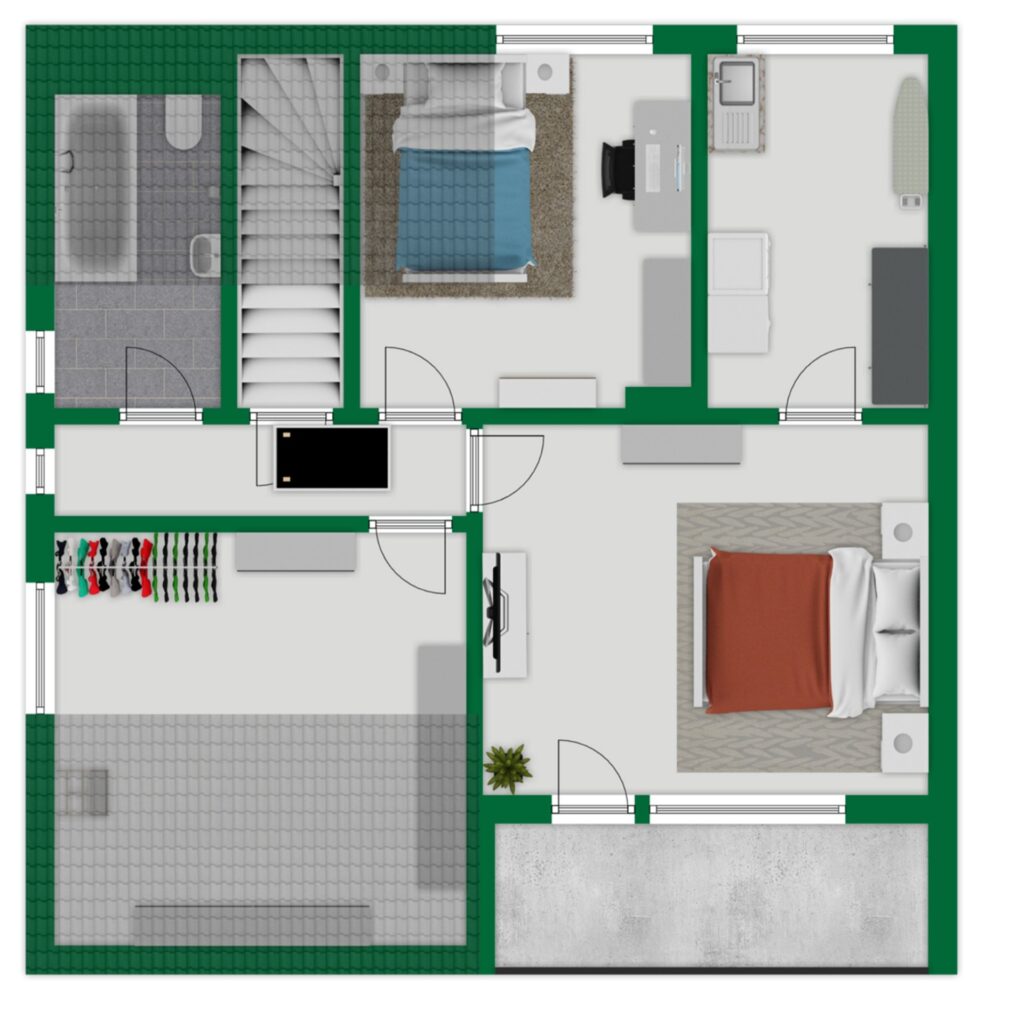 Im Obergeschoss befindet sich ein großes Schlafzimmer mit direktem Zugang zu einem weiteren Balkon. Ein kleineres Zimmer, derzeit als Küche genutzt, kann flexibel umgestaltet werden. Zwei weitere Zimmer sowie ein vollwertiges Badezimmer komplettieren diese Ebene.