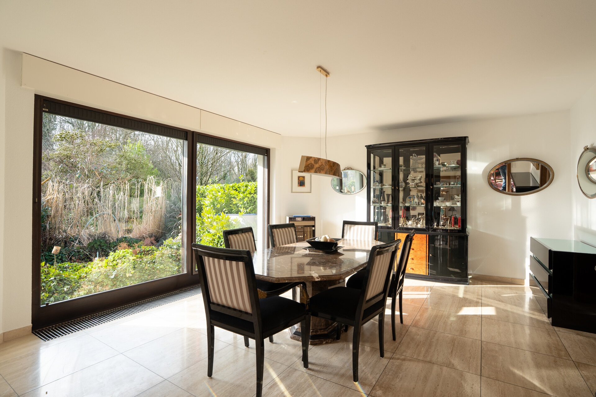 Bei Betreten des Hauses empfängt Sie eine großzügige Eingangsdiele mit Windfang, die einen einladenden ersten Eindruck hinterlässt. Der großzügige Wohn-/Essbereich von 63 m² begeistert durch bodentiefe Fenster, die einen stufenlosen Übergang zum liebevoll angelegten Garten bieten. Hier genießen Sie einen idyllischen Blick in den angrenzenden Wald. Die teilüberdachte Terrasse führt zum beheizten Außenpool, dessen Temperatur optimal durch Sonnenkollektoren reguliert wird.